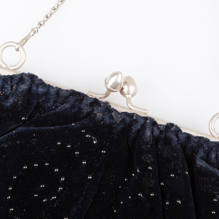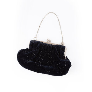 Clutch en portemonnees, 20ste eeuw. Donkerblauwe fluwelen clutch versierd met een geborduurd patroon van kraaltjes. Het tasje heeft een metalen beugel met ketting en aan de binnenzijde een donkergrijze voering; Twee portemonnees met een reliëfpatroon, zwart met een klepje en rood met een kiss-lock sluiting. Conditie: vertonen sporen van gebruik. Afmetingen clutch: ca. 12 x 20 x 2 cm. Afmetingen zwarte portemonnee: ca. 9 x 12 x 1 cm. Afmetingen rode portemonnee: ca. 9 x 10 x 1,5 cm.
