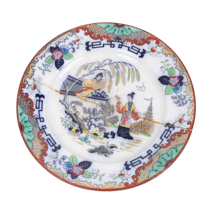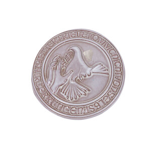 Set bestaande uit een plaquettes en twee sierbordjes. De plaquette is gemaakt van klein met grijs glazuur, daarop een afbeelding van de vredesduif met daar omheen de tekst: 'De Friede Kommt Nicht Von Selbst - Erwirderrungen'. Een schaaltje of asbak in de vorm van een hoefijzer, polychroom beschilderd met een voorstelling van een paard. Villeroy & Bosch bord van de Timor serie uit 1890-1909 met polychroom Chinees decor. Datering: eind 19de-20ste eeuw. Conditie: sporen van gebruik en ouderdomr. Afmetingen: ø11 x 0,5 cm; 20 x 16,4 x 3 cm en ø19,6 x 2,3 cm.