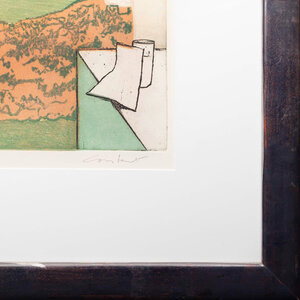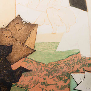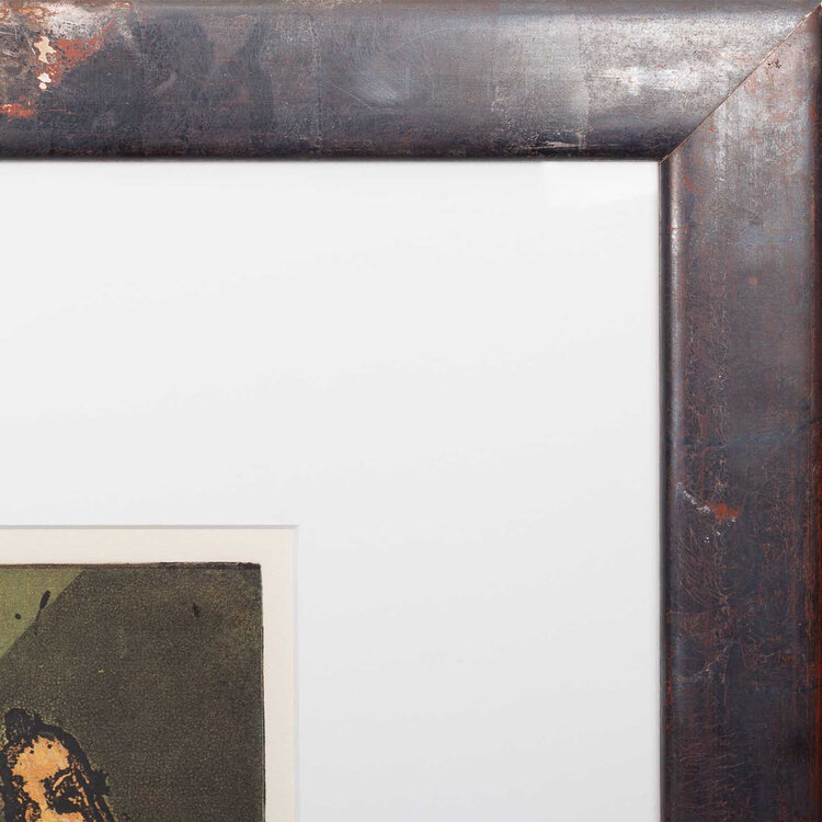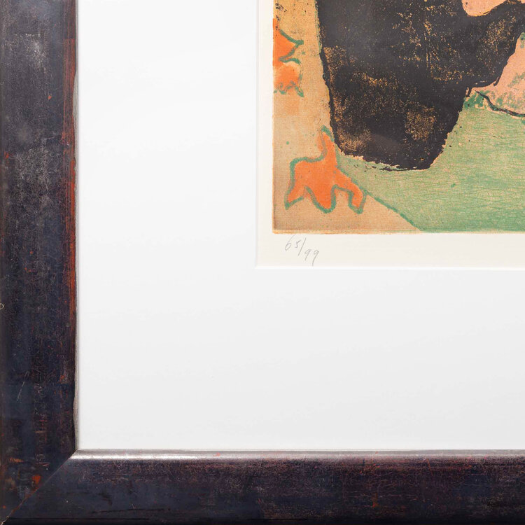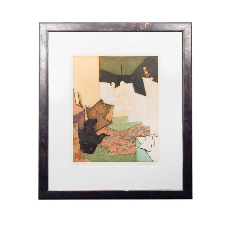 Constant Nieuwenhuijs, 'Plaisir et tristesse d'amour', 1979. Aquatint in donkergrijze/bruine lijst, oplage 65/99. Drie naakte mensen in een kamer, linksonder een zwarte hond. Signatuur rechtsonder. Afkomstig uit het album 'Plaisir et Tristesse de l'Amour' die bestaat uit vijf etsen gemaakt aan de hand van vijf schilderijen met hetzelfde thema. Conditie: werk is wat verkleurd, lijst heeft wat beschadigingen en rechts een vlek op het glas. Afmetingen lijst: 78,5 x 67 cm, beeldvlak: 46 x 36,5 cm.