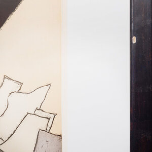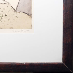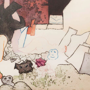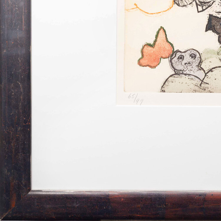 Constant Nieuwenhuijs, 'Het bondgenootschap van Casanova en de moraal', 1979. Aquatint in donkergrijze/bruine lijst, oplage 65/99. Twee naakte vrouwen en een roze figuur wat door een zwart figuur omhelsd wordt. Een vrouw ligt op bed, omringd door kussens en maskers. Signatuur rechtsonder. Afkomstig uit het album 'Plaisir et Tristesse de l'Amour' die bestaat uit vijf etsen gemaakt aan de hand van vijf schilderijen met hetzelfde thema. Conditie: werk is wat verkleurd, lijst heeft wat beschadigingen. Afmeting lijst: 77,5 x 77,5 cm, beeldvlak: 41 x 42,5 cm.