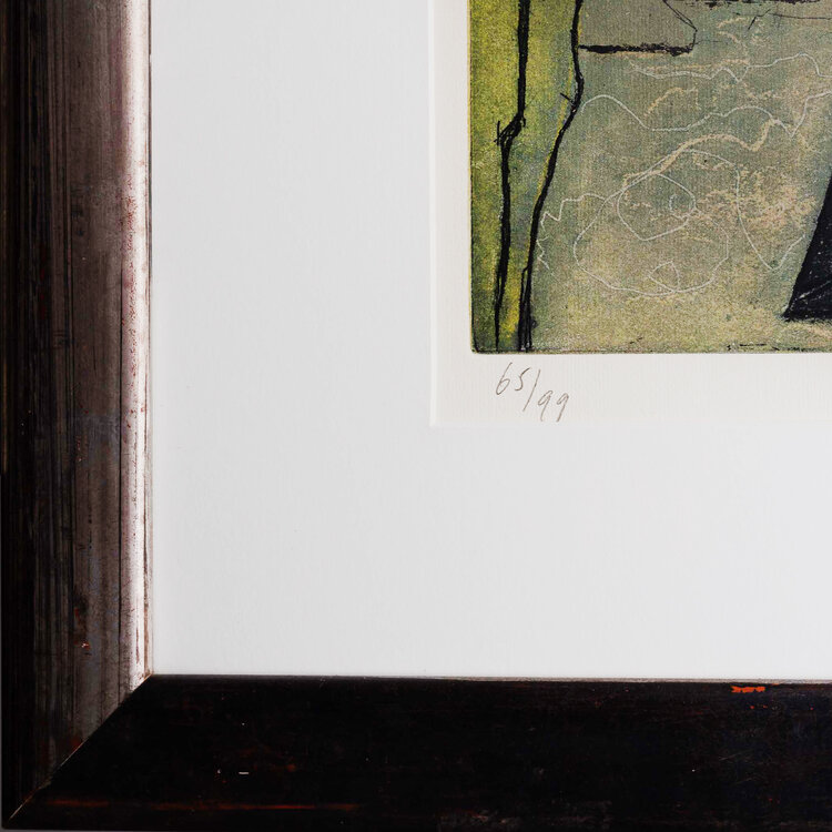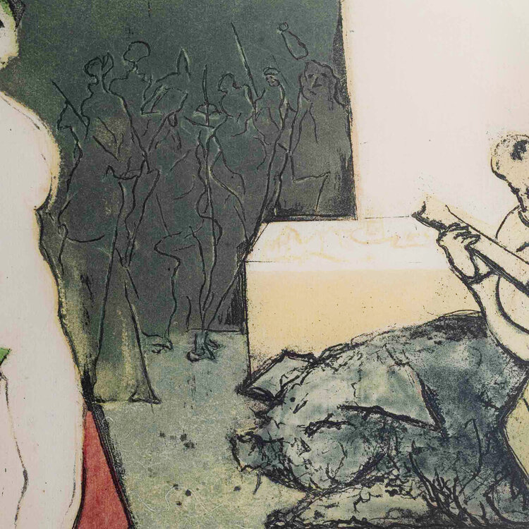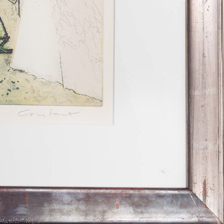 Constant Nieuwenhuijs, 'De bekering van Venus', 1979. Aquatint in donkergrijze/bruine lijst, oplage 65/99. Een groep figuren, waaronder naakten; links een vogelfiguur in zwart en rechts een man met gitaar. Signatuur rechtsonder. Afkomstig uit het album 'Plaisir et Tristesse de l'Amour' die bestaat uit vijf etsen gemaakt aan de hand van vijf schilderijen met hetzelfde thema. Conditie: werk is wat verkleurd, lijst heeft beschadigingen. Afmetingen lijst: 69 x 83 cm, beeldvlak 42,5 x 55 cm.