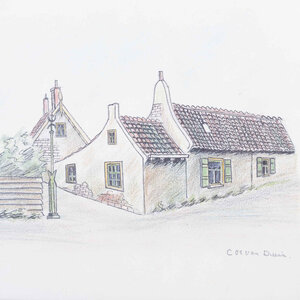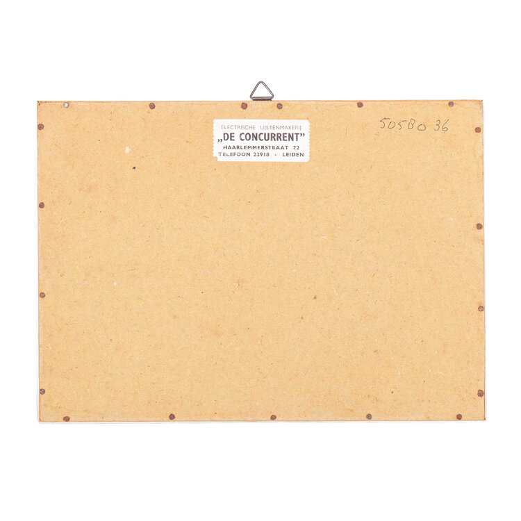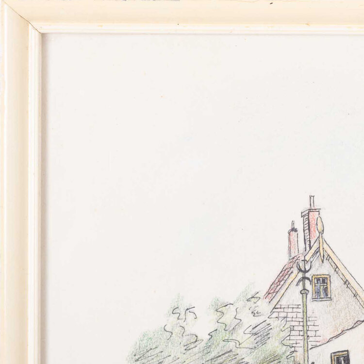 Cor van Duin, Jan Kroonsweg in Noordwijk aan Zee, datering onbekend. Kleurpotloodtekening in een beige gekleurde lijst met glas ervoor. Voorstelling: De Jan Kroosweg te Noordwijk aan Zee. Links een schutting met ervoor een lantaarn en rechts huizen. Rechtsonder gesigneerd: "Cor van Duin". Conditie: goed, lijst toont hier en daar gebruikssporen. Afmeting lijst: 15 x 23 cm.