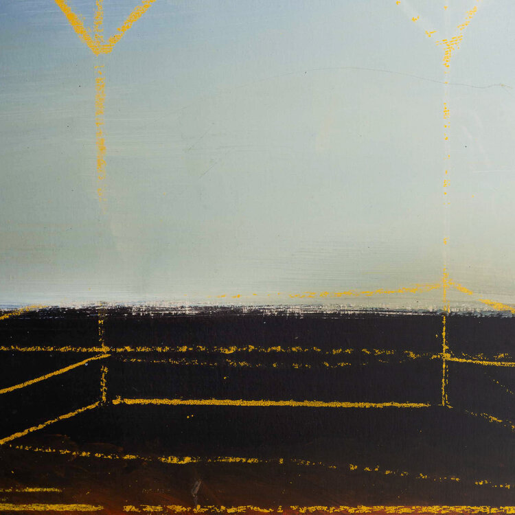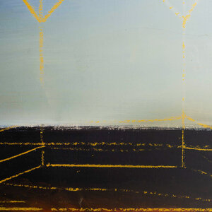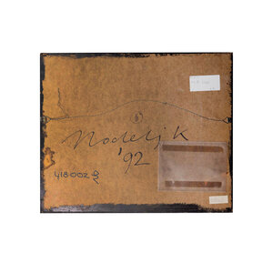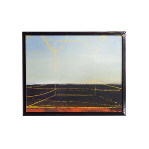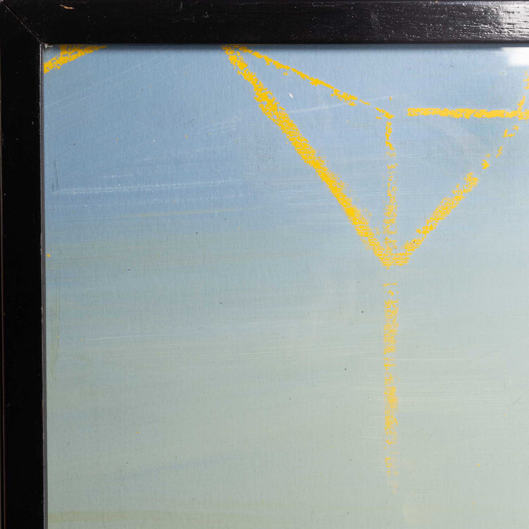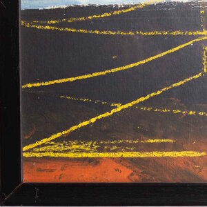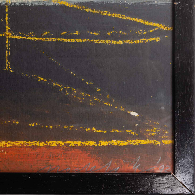 Corjan Nodelijk (Dordrecht, 1962), Zonder titel, 1992. Gemengde techniek op papier in zwarte houten lijst. Abstracte compositie van gele lijnen voor een achtergrond in blauw, zwart en rood. Signatuur rechtsonder. Conditie: Hier en daar kleine beschadigingen in de verflaag, en lijst is rechtsboven gescheurd. Afmetingen lijst: 49 x 60,5 cm.