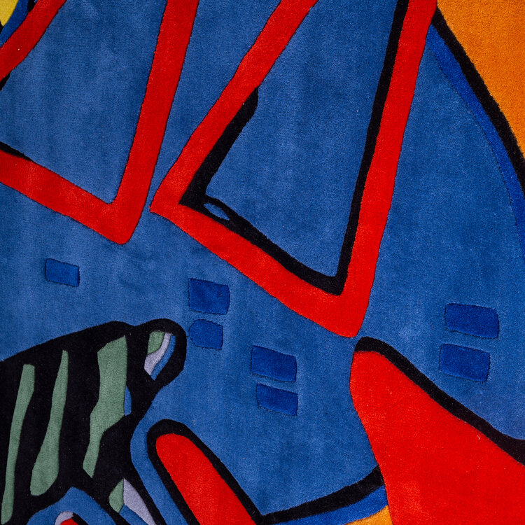 Corneille, Tapijt 'Enfant et oiseau', 1999. Handgetuft wollen vloer- of wandkleed, oplage 104/125. Afgebeeld is een voorstelling van een kind naast een gestreepte vogel en op de achtergrond een grote blauwe vogel, daar boven straalt de zon. Linksonder de signatuur 'Corneille'. Een gesigneerd papieren certificaat van echtheid wordt meegeleverd. Corneille (1922-2010) was een schilder en grafisch kunstenaar die begin jaren vijftig de conservatieve Nederlandse kunstwereld radicaliseerde. Samen met vijf andere invloedrijke kunstenaars richtte hij in 1948 de naoorlogse Europese expressionistische beweging CoBrA op. Aanvankelijk sterk beïnvloed door het werk van Picasso maakte Corneille abstract werk. Vanaf de late jaren zestig krijgt Corneille's werk een meer figuratief karakter. In dit werk zijn vogels, vrouwen en bloemen vaak het onderwerp. Conditie: als nieuw. Afmetingen: ca. 220 x 280 cm.