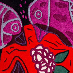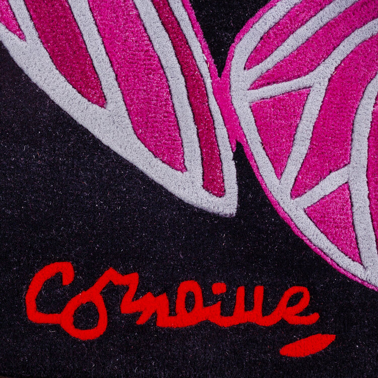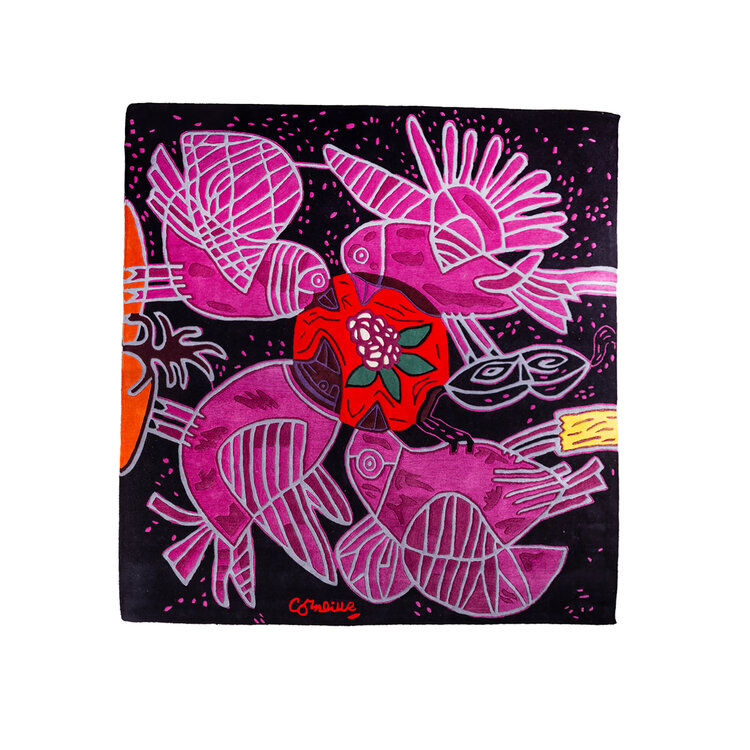Corneille, Tapijt 'La traviata', ca. 2000. Handgetuft wollen vloer- of wandkleed, oplage 60/125. Vier roze vogels rondom een rode cirkel voor een zwarte achtergrond. De signatuur 'Corneille' midden onder. Een gesigneerd papieren certificaat van echtheid wordt meegeleverd. Corneille (1922-2010) was een schilder en grafisch kunstenaar die begin jaren vijftig de conservatieve Nederlandse kunstwereld radicaliseerde. Samen met vijf andere invloedrijke kunstenaars richtte hij in 1948 de naoorlogse Europese expressionistische beweging CoBrA op. Aanvankelijk sterk beïnvloed door het werk van Picasso maakte Corneille abstract werk. Vanaf de late jaren zestig krijgt Corneille's werk een meer figuratief karakter. In dit werk zijn vogels, vrouwen en bloemen vaak het onderwerp. Conditie: als nieuw. Afmetingen: ca. 220 x 220 cm.