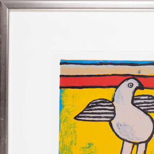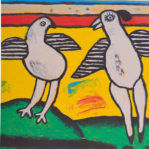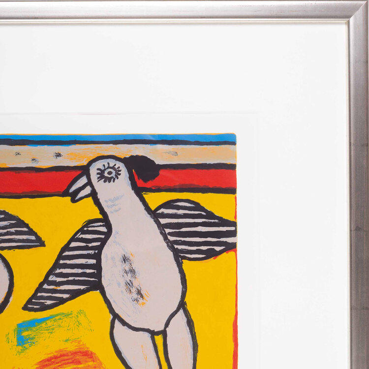 Corneille, 'Deux oiseaux', 2002. Zeefdruk op papier in zilver-kleurige lijst, oplage 25/75. Compositie met twee grijze vogels voor een kleurrijke achtergrond. Linksonder oplagenummer, rechtsonder gesigneerd met 'Corneille 2002'. Conditie: goed. Afmeting lijst: 60 x 67 cm.