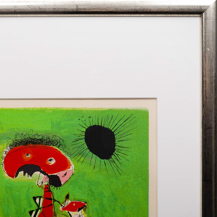Corneille, 'La port du printemps', 1986. Zeefdruk op papier in zilver kleurige lijst, oplage 133/200. Kleurrijke compositie van diverse figuren in rood voor een groene achtergrond met zwarte vlakken. Een herdruk uit 1986 van het originele werk dat Corneille in zijn vroege CoBrA-tijd in 1948 heeft geschilderd. Signatuur middenonder "Corneille '48-'86". Conditie: goed. Afmetingen lijst: 71 x 56 cm.