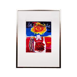 Corneille, 'La Traviata', 1990. Zeefdruk op papier in goudkleurige lijst, oplage 11/200. Scene uit de opera van Giuseppe Verdi. Afbeelding van een vrouw liggend op haar rug, in de kleuren rood, blauw en geel. In de lucht staat geschreven: "La Traviata". Linksonder oplagenummer, rechtsonder signatuur. Afkomstig uit de serie: 'Hommage aan Verdi.' Conditie: goed. Afmeting incl lijst: ca. 83 x 63 x 2 cm.