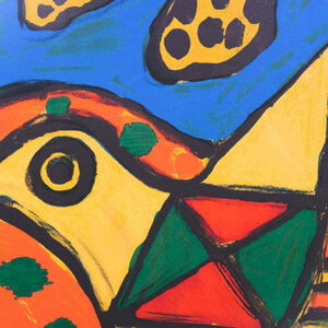 Corneille, L'Arbre orange, 2010. Litho in zilverkleurige lijst, oplage 36/130. Kleurrijke voorstelling van een oranje boom met daarnaast een gezicht en een vogel. Signatuur Corneille 2010, midden onder. Corneille (1922-2010) was een schilder en grafisch kunstenaar die begin jaren vijftig de conservatieve Nederlandse kunstwereld radicaliseerde. Samen met vijf andere invloedrijke kunstenaars waaronder Karel Appel en Constant richtte hij in 1948 de naoorlogse Europese expressionistische beweging CoBrA op. Corneille volgde tussen 1940 en 1942 cursussen tekenen en etsen aan de Academie van Beeldende Kunsten in Amsterdam, maar wordt over het algemeen beschouwd als een autodidactische schilder. Aanvankelijk sterk beïnvloed door het werk van Picasso maakte Corneille abstract werk. Vanaf de late jaren zestig krijgt Corneille's werk een meer figuratief karakter. In dit werk zijn vogels, vrouwen en bloemen vaak het onderwerp. Conditie: goed. De lijst heeft enkele lichte gebruikssporen. Afmeting lijst: 120 x 101 cm.