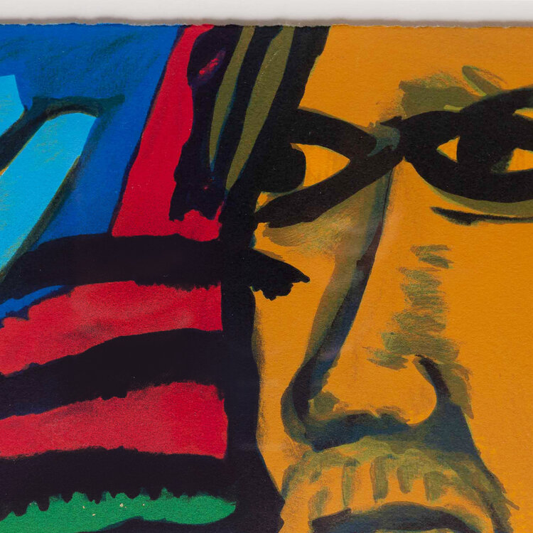 Corneille, Les moments allègres, 2009. Litho op papier in zilver kleurige lijst, oplage van 130. Kleurrijke afbeelding van een vrouw en man in okergeel met een blauwe vogel, rechtsonder een hond. Signatuur rechtsonder 'Corneille '09'. Conditie: het werk is in goede conditie, de lijst toont lichte gebruikssporen. Afmetingen lijst: 102 x 125 cm.