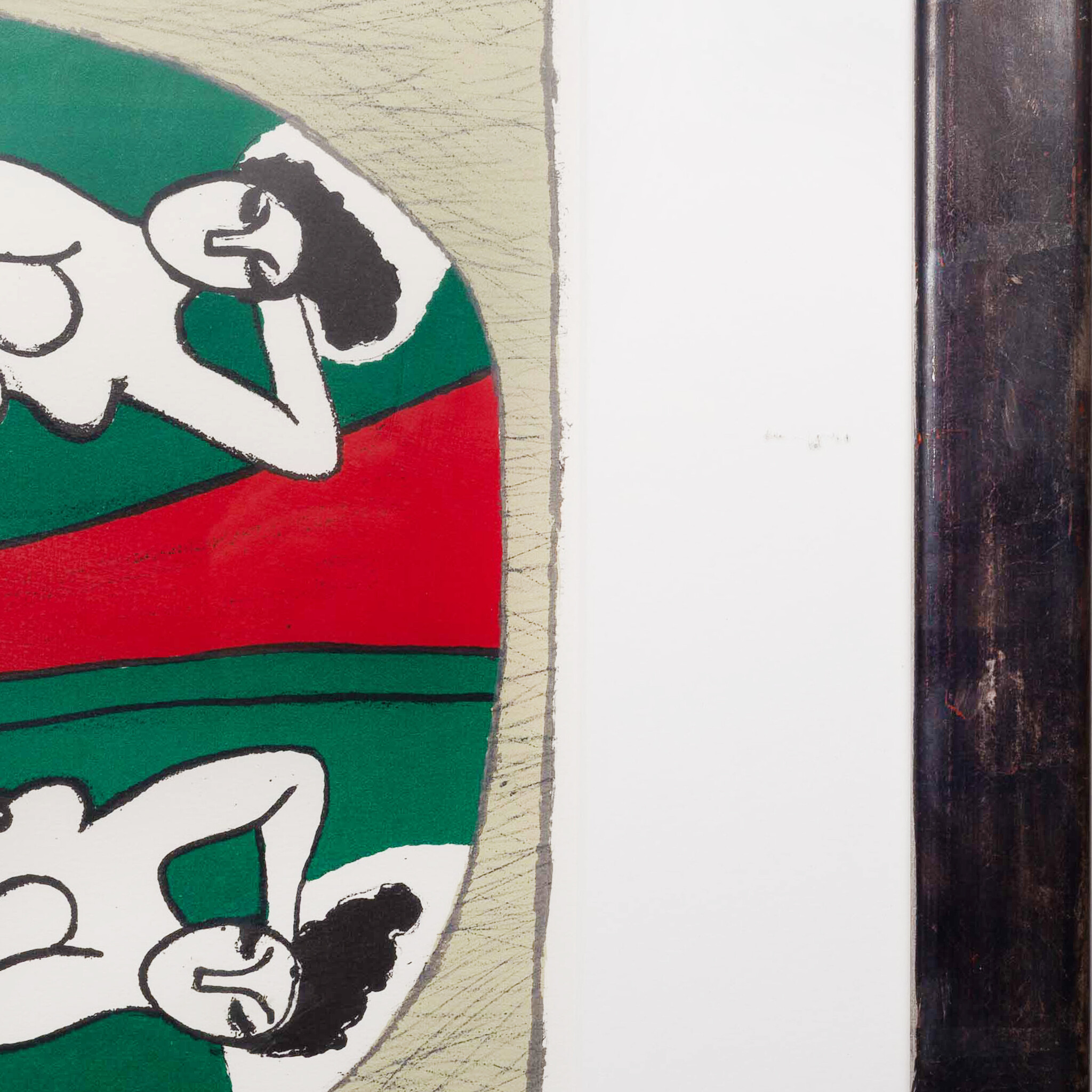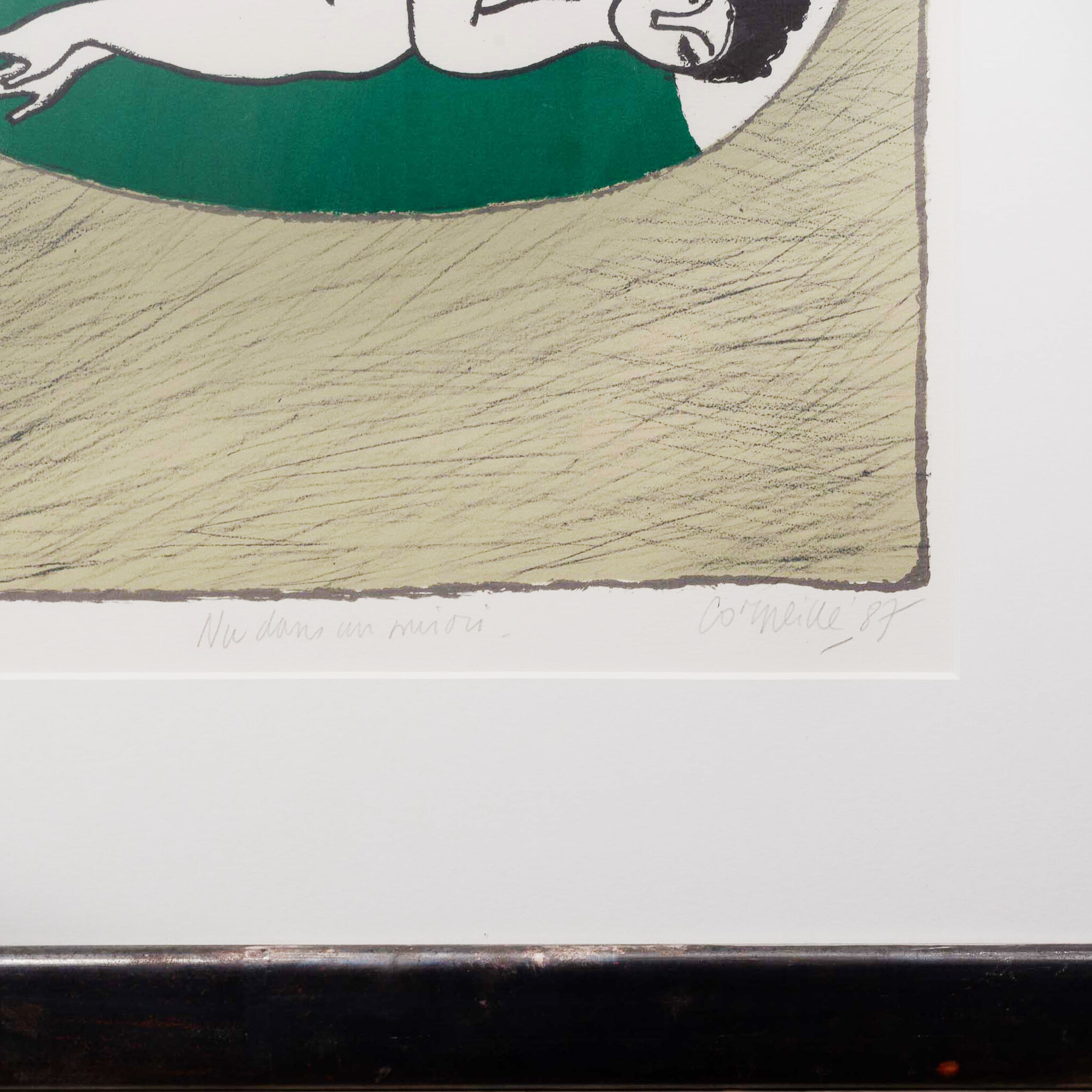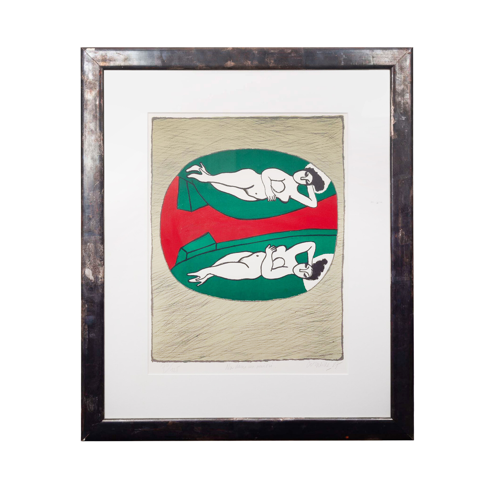 Corneille, 'Nu dans un miroir', 1987. Zeefdruk in donkergrijze/bruine lijst, oplage 70/125. Liggend naakte vrouw met spiegelbeeld in een rood met groen vlak voor een grijze achtergrond. Signatuur rechtsonder. Conditie: werk is in goede conditie, lijst heeft beschadigingen en krassen op de kunststof plaat. Afmetingen lijst: 74,5 x 62,5 cm, beeldvlak: 46 x 36 cm.