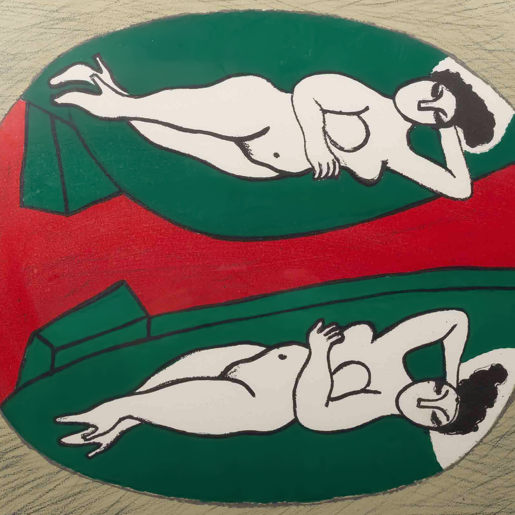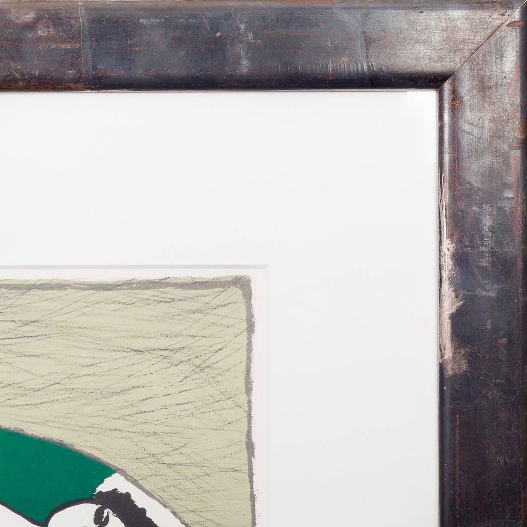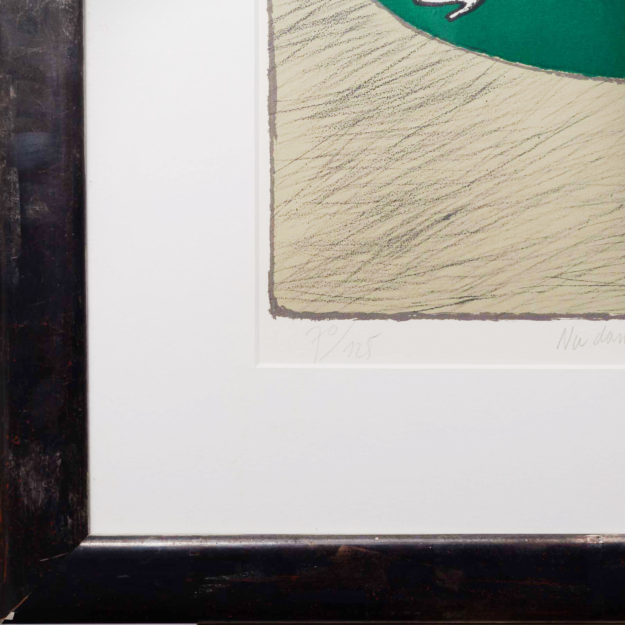 Corneille, 'Nu dans un miroir', 1987. Zeefdruk in donkergrijze/bruine lijst, oplage 70/125. Liggend naakte vrouw met spiegelbeeld in een rood met groen vlak voor een grijze achtergrond. Signatuur rechtsonder. Conditie: werk is in goede conditie, lijst heeft beschadigingen en krassen op de kunststof plaat. Afmetingen lijst: 74,5 x 62,5 cm, beeldvlak: 46 x 36 cm.