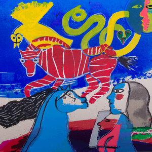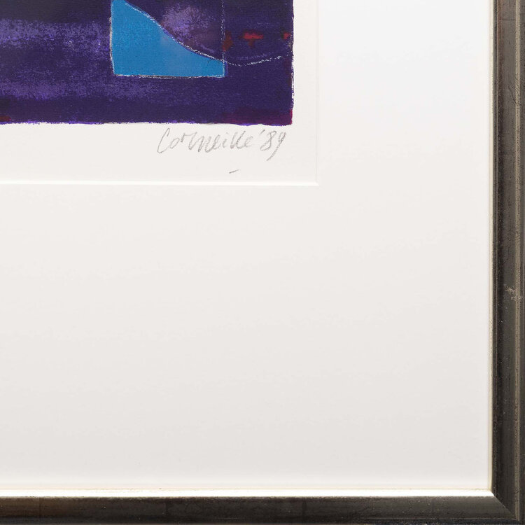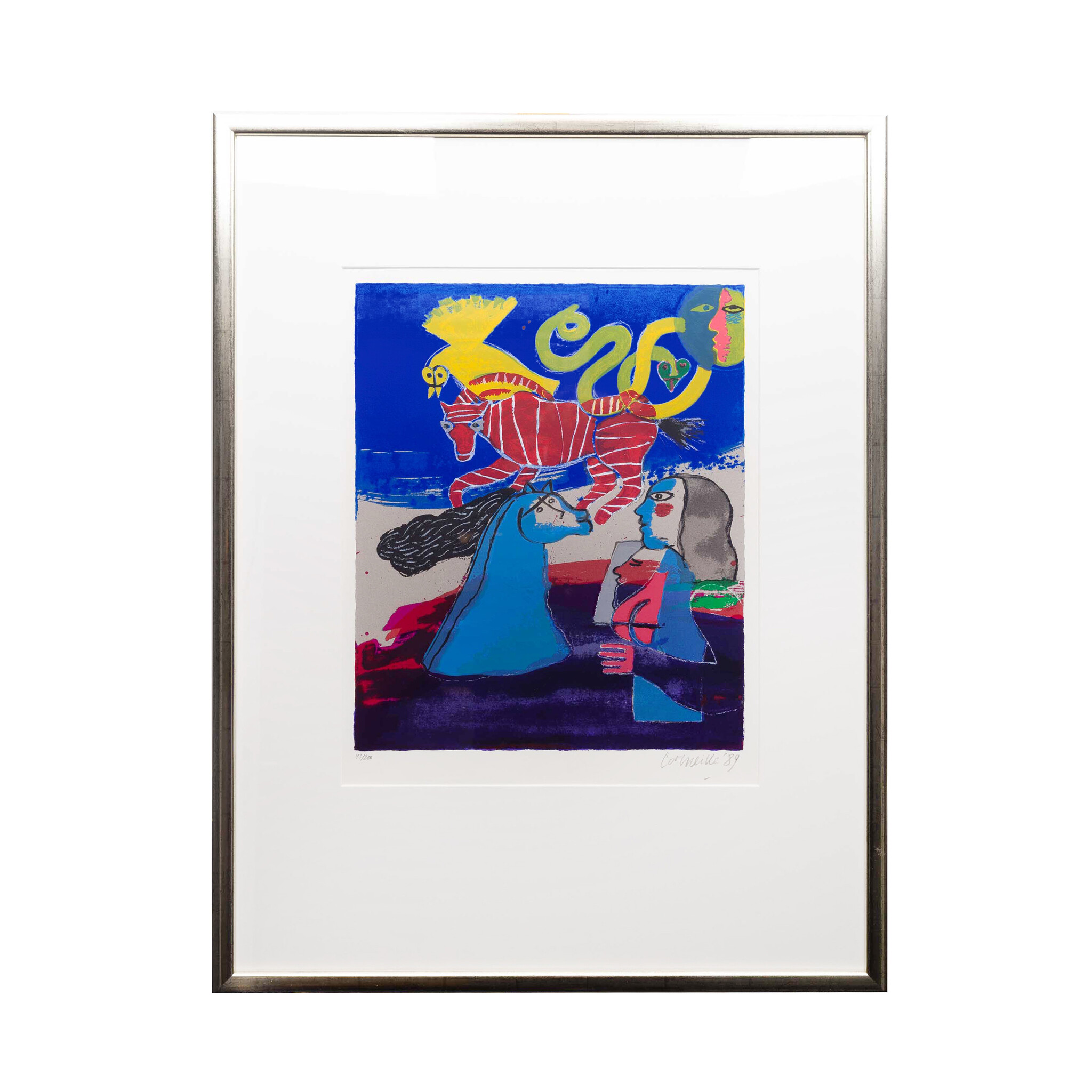 Corneille, 'Six Rêves Peints III', 1989. Zeefdruk op papier in zilver kleurige lijst, oplage 43/200. Compositie met een vrouw en twee paarden voor een donker blauwe achtergrond. Signatuur rechtsonder "Corneille '89". Het werk is afkomstig uit de serie 'Six Rêves Peints' (zes geschilderde dromen), geïnspireerd door het werk van Lewis Carroll, George Luis Borges, Henry Micaux, Antonio Machado, Paul Edward en Gaston Bachelard. Conditie: goed. Afmetingen lijst: 83 x 63 cm.