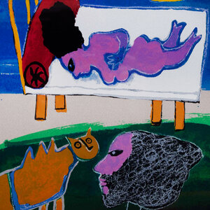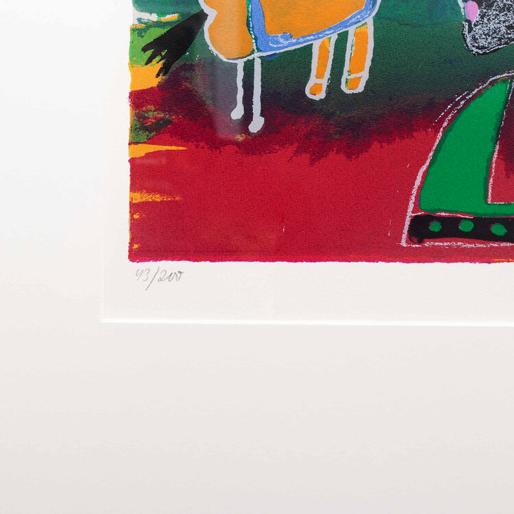 Corneille, 'Six Rêves Peints V', 1989. Zeefdruk op papier in zilver kleurige lijst, oplage 43/200. Compositie met een vrouw liggend in bed, daaronder een kat en een man met baard en in de lucht twee vogels. Signatuur rechtsonder "Corneille '89". Het werk is afkomstig uit de serie 'Six Rêves Peints' (zes geschilderde dromen), geïnspireerd door het werk van Lewis Carroll, George Luis Borges, Henry Micaux, Antonio Machado, Paul Edward en Gaston Bachelard. Conditie: goed. Afmetingen lijst: 83 x 63 cm.