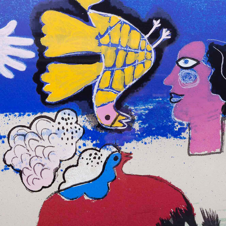 Corneille, 'Six Rêves Peints VI', 1989. Zeefdruk op papier in zilver kleurige lijst, oplage 43/200. Compositie van een man met masker en in de lucht twee vogels en kop van een vrouw en profil. Signatuur rechtsonder "Corneille '89". Het werk is afkomstig uit de serie 'Six Rêves Peints' (zes geschilderde dromen), geïnspireerd door het werk van Lewis Carroll, George Luis Borges, Henry Micaux, Antonio Machado, Paul Edward en Gaston Bachelard. Conditie: goed. Afmetingen lijst: 83 x 63 cm.