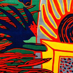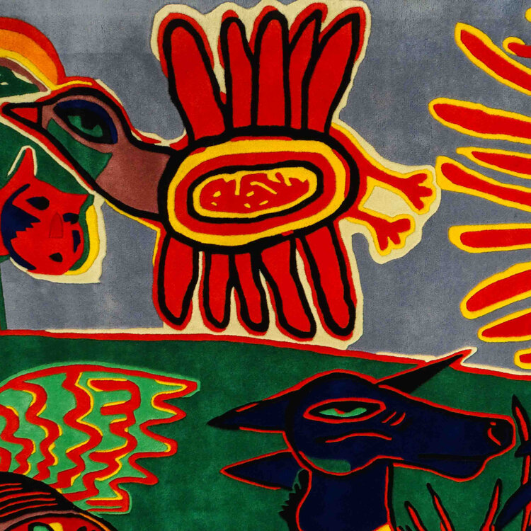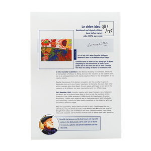 Corneille, Tapijt 'Le chien bleu', 2008. Handgetuft wollen vloer- of wandkleed met daarop een kleurrijke voorstelling van blauwe hond met daarnaast een gezicht en profil, linksboven een rode kat een een vogel. Oplage van 125, onderin de signatuur 'Corneille'. Aan de achterzijde is een label met echtheid certificaat bevestigd en een papieren certificaat van echtheid wordt meegeleverd. Corneille (1922-2010) was een schilder en grafisch kunstenaar die begin jaren vijftig de conservatieve Nederlandse kunstwereld radicaliseerde. Samen met vijf andere invloedrijke kunstenaars waaronder Karel Appel en Constant richtte hij in 1948 de naoorlogse Europese expressionistische beweging CoBrA op. Corneille volgde tussen 1940 en 1942 cursussen tekenen en etsen aan de Academie van Beeldende Kunsten in Amsterdam, maar wordt over het algemeen beschouwd als een autodidactische schilder. Aanvankelijk sterk beïnvloed door het werk van Picasso maakte Corneille abstract werk. Vanaf de late jaren zestig krijgt Corneille's werk een meer figuratief karakter. In dit werk zijn vogels, vrouwen en bloemen vaak het onderwerp. Conditie: als nieuw. Afmetingen: 200 x 280 cm.