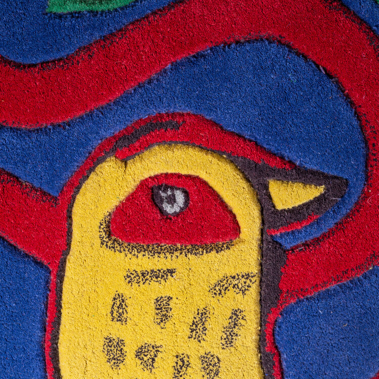 Corneille, Tapijt 'Rêve aquatique', jaren 90. Handgetuft wollen vloer- of wandkleed, oplage XXIII/XXXV. Afgebeeld is een kleurrijke voorstelling met twee vrouwen, twee vogels en een kat voor een blauwe achtergrond. De signatuur 'Corneille' midden rechts. Een gesigneerd papieren certificaat van echtheid wordt meegeleverd. Corneille (1922-2010) was een schilder en grafisch kunstenaar die begin jaren vijftig de conservatieve Nederlandse kunstwereld radicaliseerde. Samen met vijf andere invloedrijke kunstenaars richtte hij in 1948 de naoorlogse Europese expressionistische beweging CoBrA op. Aanvankelijk sterk beïnvloed door het werk van Picasso maakte Corneille abstract werk. Vanaf de late jaren zestig krijgt Corneille's werk een meer figuratief karakter. In dit werk zijn vogels, vrouwen en bloemen vaak het onderwerp. Conditie: als nieuw. Afmetingen: ca. 200 x 250 cm.