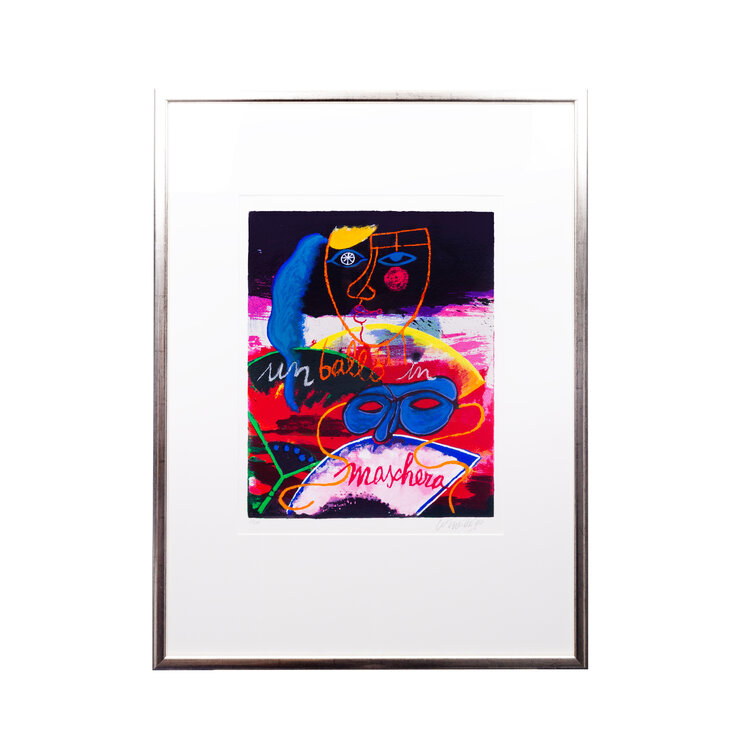 Corneille, 'Un ballo in Maschera', 1990. Zeefdruk op papier in goudkleurige lijst, oplage 11/200. Scene uit de opera van Giuseppe Verdi. Afbeelding van verschillende maskers, in de kleuren rood, blauw, geel en zwart. Op het werk staat geschreven: "Un ballo in Maschera". Afkomstig uit de serie: 'Hommage aan Verdi.' Linksonder oplagenummer, rechtsonder signatuur. Conditie: goed. Afmeting incl lijst: ca. 83 x 63 x 2 cm.
