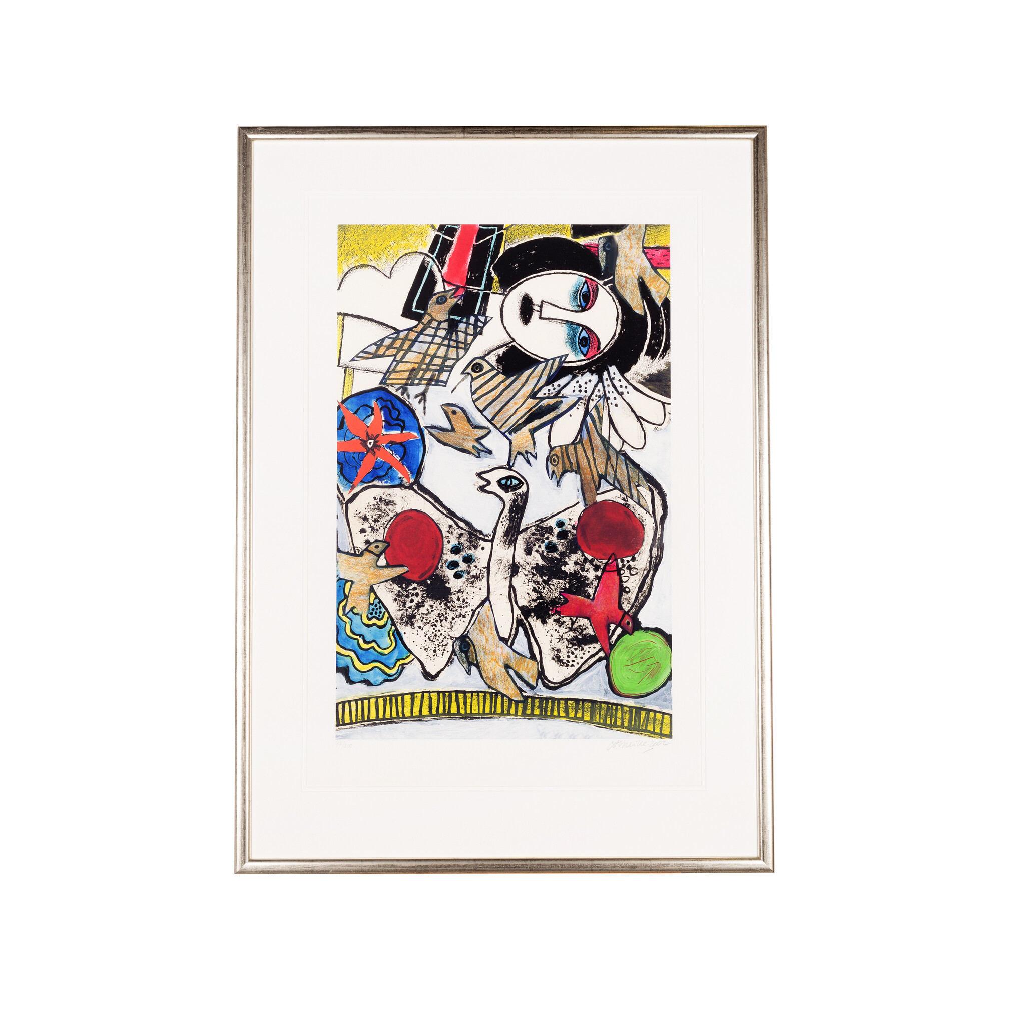 Corneille, 'Vol d'oiseaux', 2002. Litho in zilverkleurige lijst met dubbel passe-partout, oplage 47/200. Compositie met een naakte vrouw en daar omheen vliegen meerdere vogels. Signatuur rechtsonder 'Corneille 2000'. Corneille (1922-2010) was een schilder en grafisch kunstenaar die begin jaren vijftig de conservatieve Nederlandse kunstwereld radicaliseerde. Samen met vijf andere invloedrijke kunstenaars richtte hij in 1948 de naoorlogse Europese expressionistische beweging CoBrA op. Aanvankelijk sterk beïnvloed door het werk van Picasso maakte Corneille abstract werk. Vanaf de late jaren zestig krijgt Corneille's werk een meer figuratief karakter. In dit werk zijn vogels, vrouwen en bloemen vaak het onderwerp. Conditie: goed. Afmetingen passe-partout: 80 x 53 cm; lijst: 100 x 72 cm.
