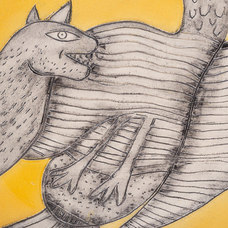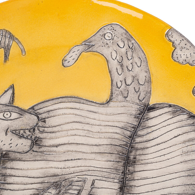 Corneille, Wandbord, 2004. Keramiek wandbord met afbeelding van een vogel en kat voor een gele achtergrond. Signatuur Links "Corneille 2004." Aan de achterkant gemerkt met "70 G" en stempel van 'La Tuilerie à Treigny'. Aan de achterzijde tevens een metalen draad waarmee het bord opgehangen kan worden. Conditie: Goed met minimale sporen van gebruik. Afmetingen: ca. ø 52 x 11 cm.