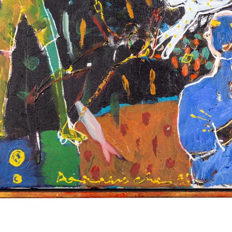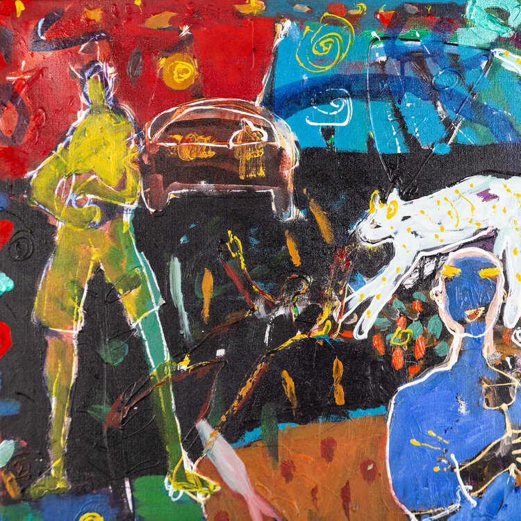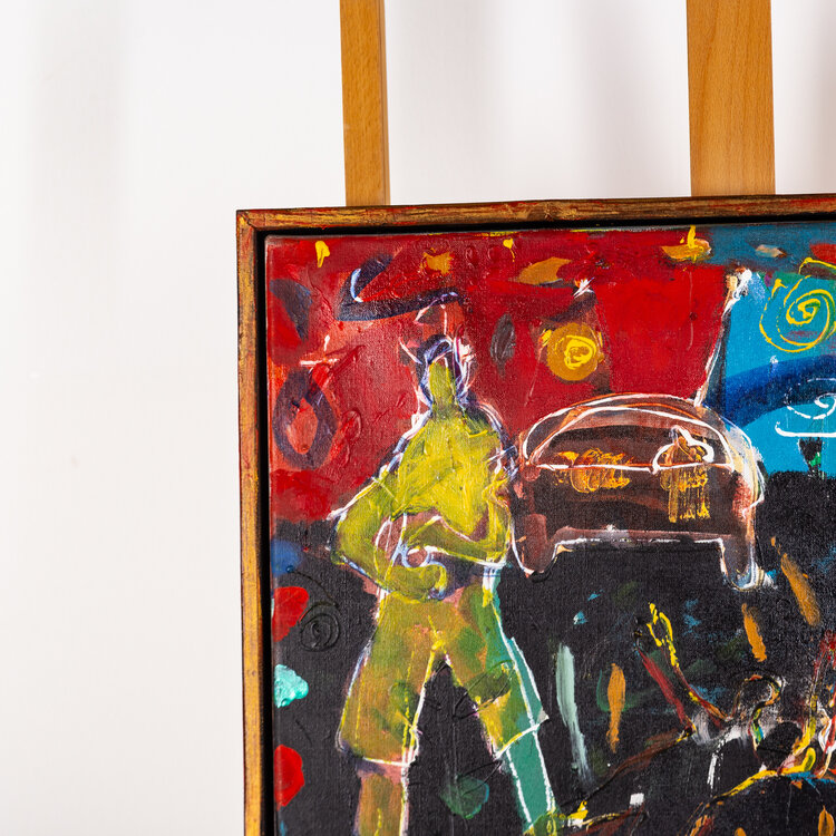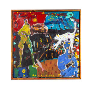 D. Chan, Zonder titel, 1996. Acryl op doek in rood geschilderde houten lijst. Kleurrijke voorstelling met links een persoon in geel naast auto en rechts een persoon in blauw met wijnglas en witte kat erboven. Signatuur en jaartal onderaan. Conditie: goed, gebruikssporen aan lijst. Afmeting: 58 x 58 cm.
