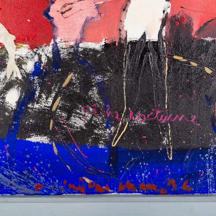 D. Chan, Zonder titel, 1996. Acryl op doek in grijs geschilderde houten lijst. Abstracte voorstelling met een zwart-wit persoon voor een rood, blauw en gele achtergrond. Signatuur en jaartal onderaan. Conditie: goed, gebruikssporen aan lijst. Afmeting: 73 x 73 cm.