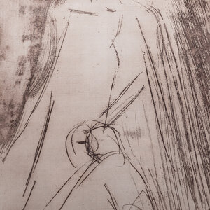 David Granaat (Amsterdam, 1914 - Alkmaar, 2005), 'Groot Schuilen I'. Ets, eigen druk, in metalen lijst met passe-partout. Schets van twee staande en een zittend figuur, afgedrukt met zwarte inkt. Serie Drukkerstroost. Signatuur rechtsonder. Datering: 1980. Conditie: verkleuring papier, gebruikssporen lijst, bovenkant lijst zit los, vlekken op glasplaat. Afmetingen lijst: 70,5 x 50,5 cm; beeldvlak: 39 x 24,5 cm.