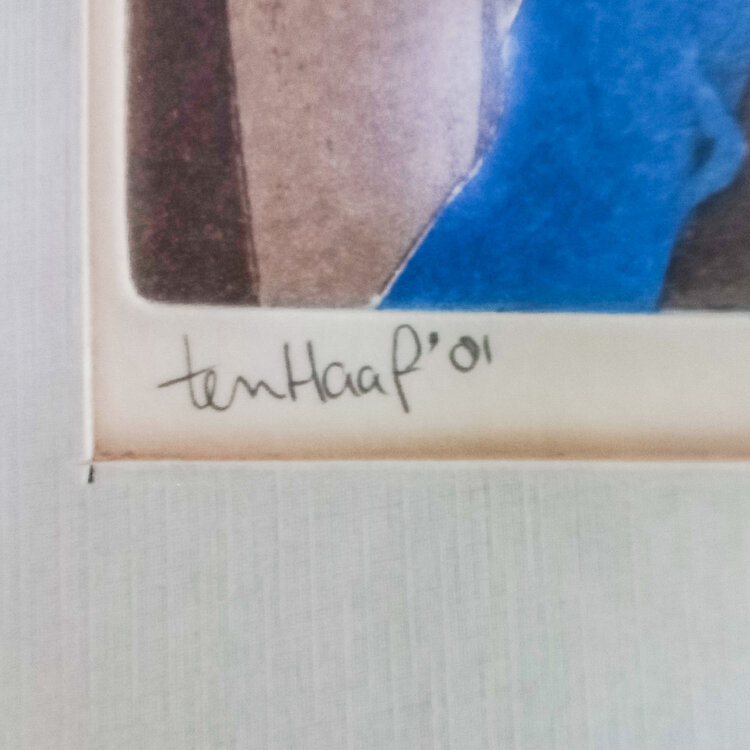 Dick ten Haaf, Kinderdroom, 1981. Ets / aquatint in metalen lijst, oplage 1/15. Compositie met links twee figuren in blauwe kleding voor een raam en rechts een ruiÃàne met doorkijkje naar een gebouw. Signatuur linksonder. Conditie: werk is in prima staat, lijst tootn gebruikssporen en glasplaat is diagonaal gebroken. Afmetingen: ca. 71 x 89 x 2,5 cm.