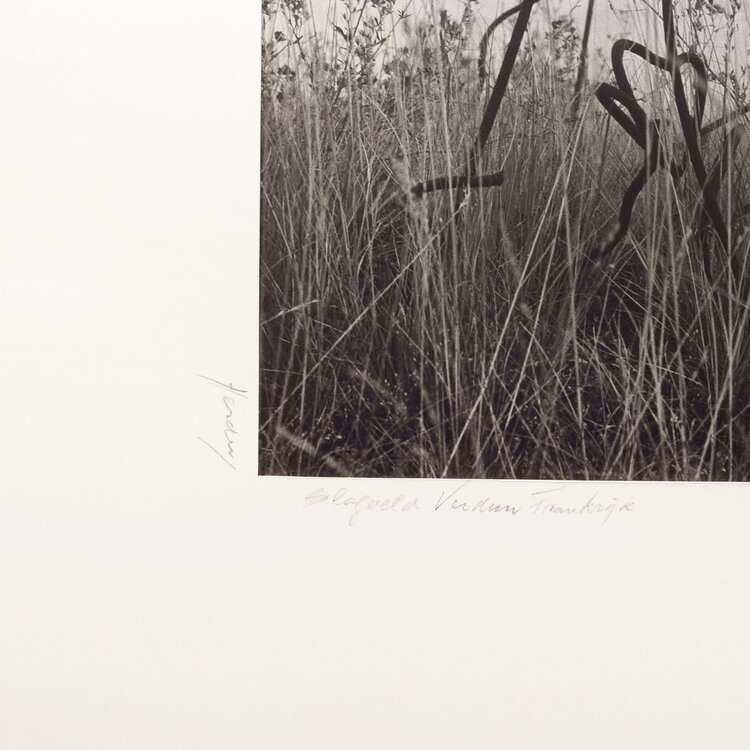 Dirk de Herder, Slagveld Verdun Frankrijk, jaartal onbekend. Zwart-wit foto in metalen lijst. Close-up van een grasveld met daarin zwarte lijnen. Linksonder titelen signatuur. Aan de achterzijde is een envelop bevestigd met daarin een boekje met biografie en info over de kunstenaar en zijn werk. Conditie: goed, gebruikssporen aan lijst en glas mist. Afmeting werk zonder lijst: 39 x 29 cm, 60 x 52 cm.