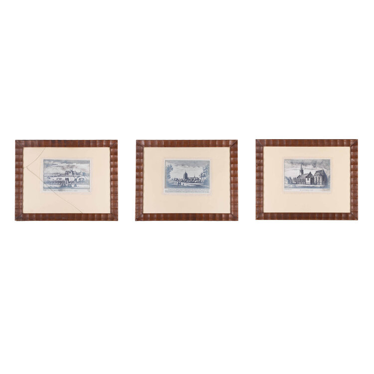 Dirk Pander, drie facsimile afdrukken van etsen met historische zichten op Noordwijk en Rijswijk. 'Noortwyk op Zee', 1630 door Abraham Rademaker; 'Abdye van Lewenhorst in Welstant', 1560 door onbekende kunstenaar en 'Noordwyk binnen, gelegen in Rynlant tusschen Katwyk op Ryn en Noortwyker-hout, een der uytstrkendste dorpen van gantsch Hollant, over lange jaren al bekent in de meeste jaarboeken van Hollant. Dus is het afgebeelt met zijne schone Kerk in den Jare 1630' door onbekende kunstenaar. De afdrukken zijn bevestigd op een soort zijde-papier en ingelijst in houten lijst met passe-partout. Rechtsonder is 'D. Pander Leiden' in het papier geëmbosst. Dirk Pander in 1895-1933 werkzaam in Leiden als retoucheur en fotograaf. Conditie: De achterbladen zijn wat vergeeld en de lijsten tonen gebruikssporen, een lijst heeft barsten in het glas. Afmeting per lijst: 39 x 48 cm.
