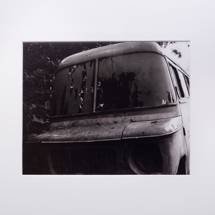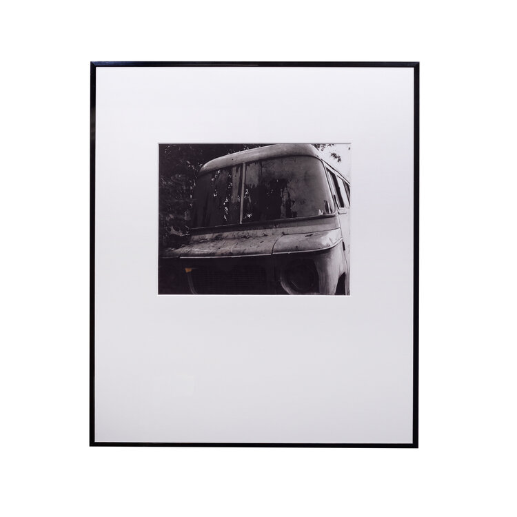 Dömötör, 'Oude autobus'. Zwart-witfoto van de voorkant van een oude autobus in metalen lijst met passe-partout. Datering onbekend. Conditie: gebruikssporen lijst. Afmetingen lijst: 77 x 64,5 cm; beeldvlak: 30 x 37,5 cm.