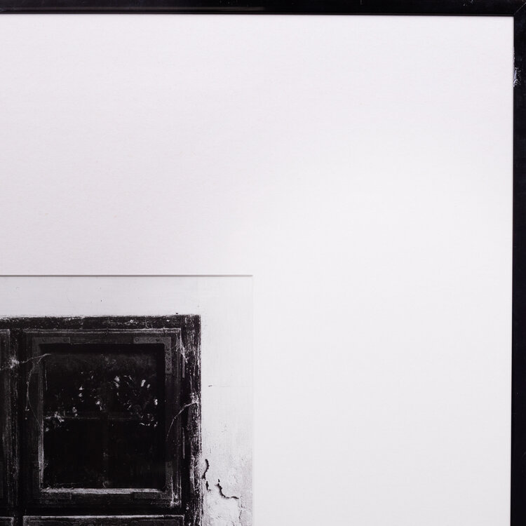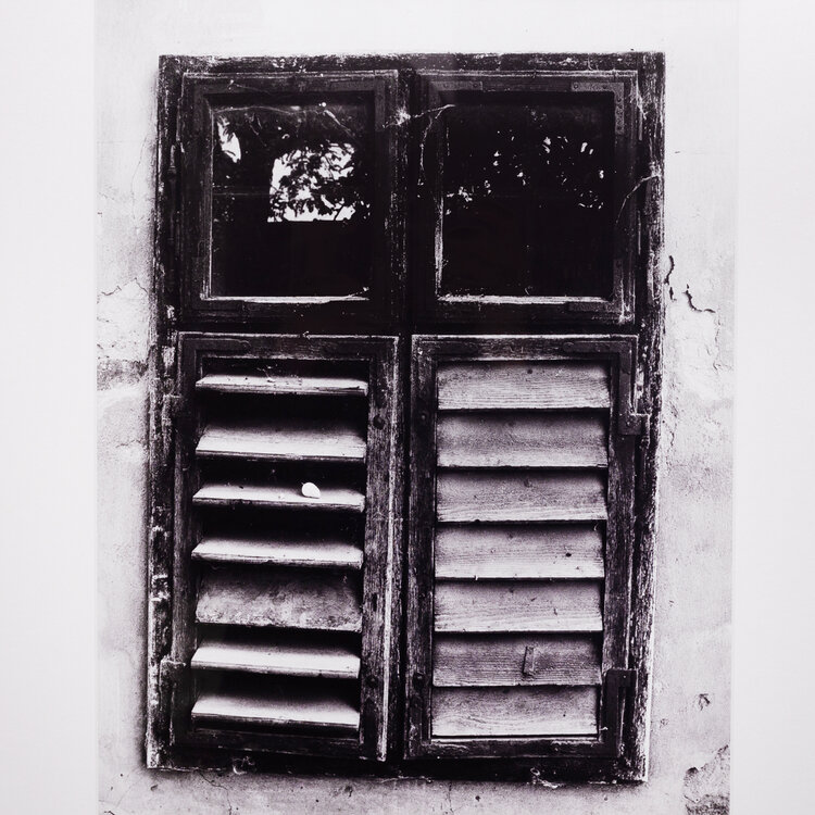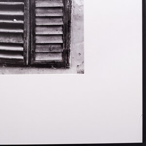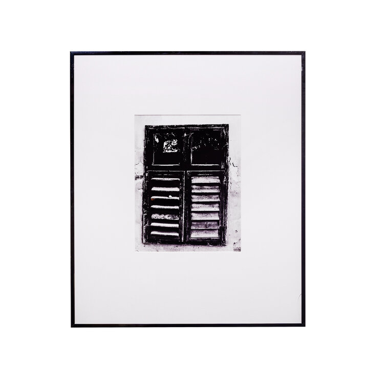 Dömötör, 'Raamluiken'. Zwart-witfoto van luiken en ramen van een huis, in metalen lijst met passe-partout. Datering onbekend. Conditie: gebruikssporen lijst. Afmetingen lijst: 77 x 64,5 cm; beeldvlak: 29 x 37,5 cm.
