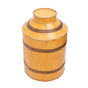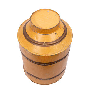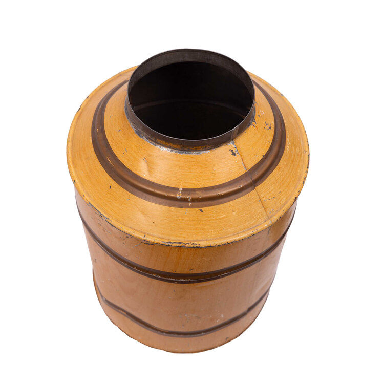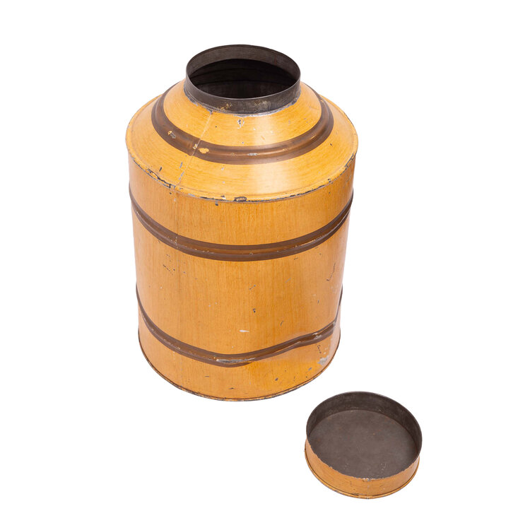 Uitlotingsbus van onbekende maatschappij. Sommige bedrijven gaven obligatieleningen uit. Met behulp van een uitlotingsbus werd door loting bepaald welke stuknummers van leningen op een vooraf bepaald tijdstip (deels) werden afgelost. Het blik is geel geverfd met gouden lijnen. Datering: eerste helft 20ste eeuw. Conditie: gebruikt, een deuk aan de zijkant. Afmetingen: ca. 35 x ø 25,5 cm.