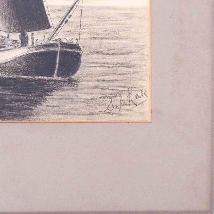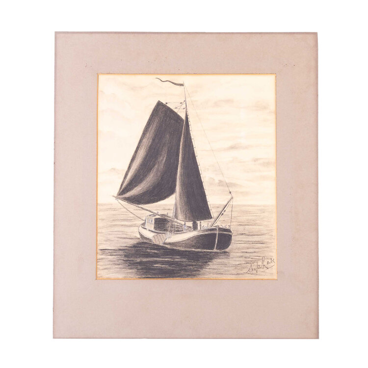 Tekening van een zeilboot door onbekende kunstenaar. Conté met potlood op papier in grijs passe-partout zonder lijst. Afbeelding van een zeilboot op zee in zwart-wit. Linksonder (onleesbaar) signatuur. Datering onbekend. Conditie: het werk en passe-partout zijn wat verkleurd en een aan de achterzijde zijn wat beschadigingen in het papier te zien. Afmetingen passe-partout: 54 x 46 cm.