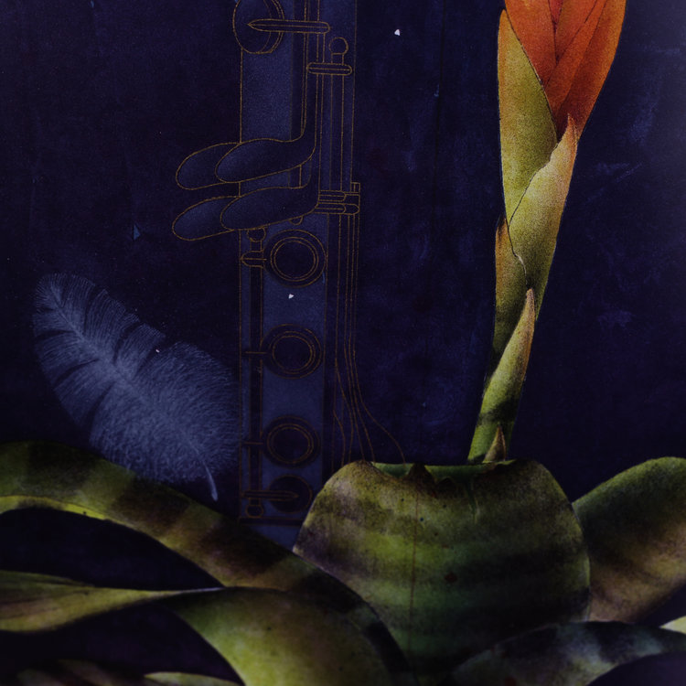 E. Hanke, Klarinet, 1996. Steendruk in metalen lijst, oplage e.a. Afbeelding van een vriesea voor donkere achtergrond, waar een klarinet in zichtbaar is. Linksonder met potlood e.a., rechtsonder signatuur en jaar. Conditie: gebruikssporen aan lijst. Afmeting werk zonder lijst: 40 x 50 cm, incl. lijst: 74 x 63 cm.