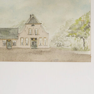 E. Koopman-Bleeker, Beneden buurt- Kleine sluis in 1895, 1988. Aquarel op papier in metalen lijst. Realistische voorstelling van huisjes aan een straat met een blauwe lucht. Conditie: goed, gebruikssporen aan lijst. Afmeting lijst: 49 x 61 cm.