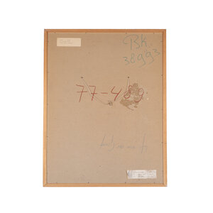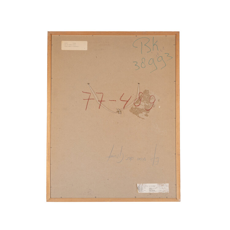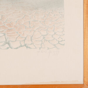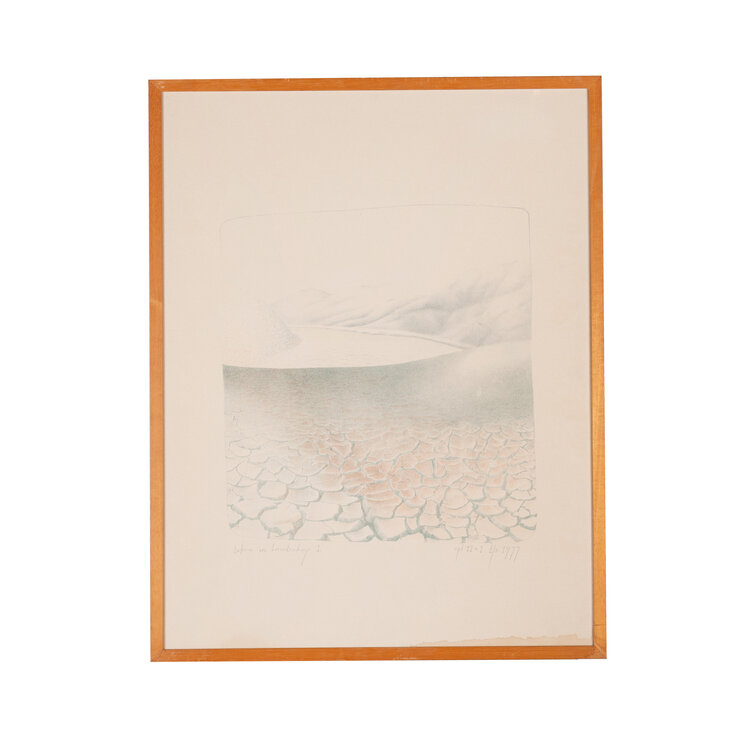 Els van der Graaf, 'Teken in Landschap 1', 1977. Litho oplage 11 + 1, in houten lijst. Afbeelding van een landschap met een gebarsten grond op de voorgrond en heuvels op de achtergrond. Titel linksonder. Signatuur, oplage en datum rechtsonder. Conditie: lijst vertoont gebruikssporen, waterschade rechtsonder. Afmetingen: ca. 67,5 x 52,5 x 1,5 cm.
