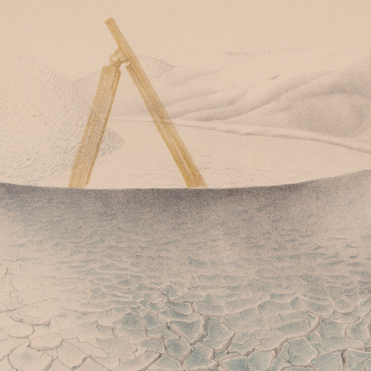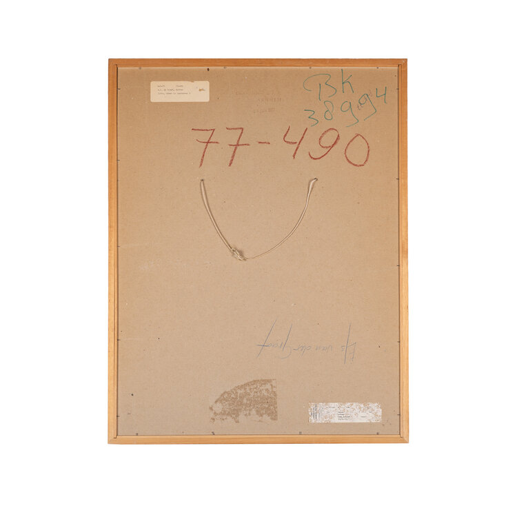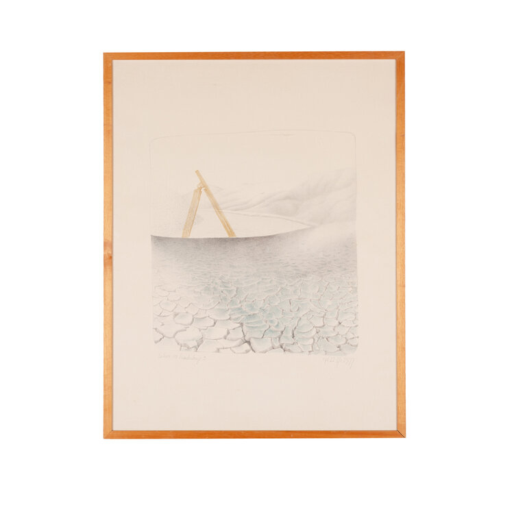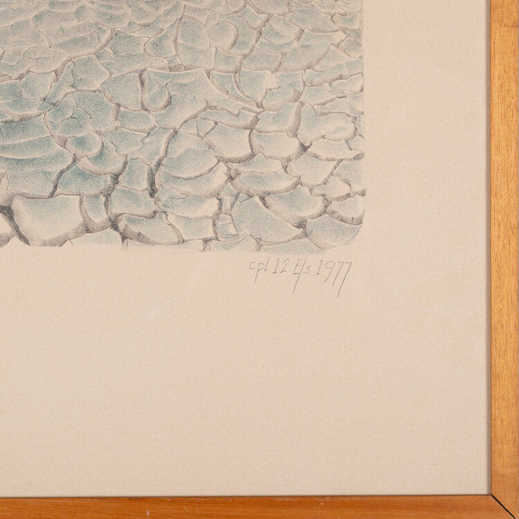 Els van der Graaf, 'Teken in Landschap 3', 1977. Litho oplage 12, in houten lijst. Afbeelding van een landschap met een gebarsten grond op de voorgrond en heuvels op de achtergrond. In het landschap staat een houten constructie. Titel linksonder. Signatuur, oplage en datum rechtsonder. Conditie: lijst vertoont gebruikssporen, plakbandresten op glasplaat. Afmetingen: ca. 67,5 x 52,5 x 1,5 cm.