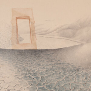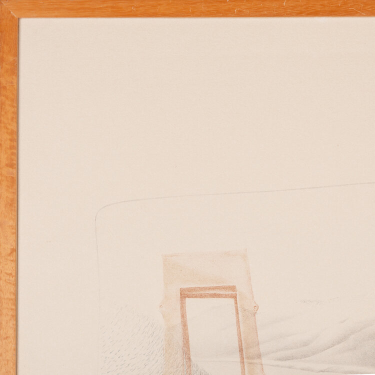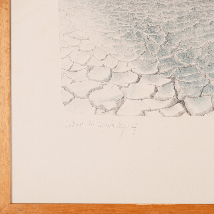 Els van der Graaf, 'Teken in Landschap 4', 1977. Litho oplage 12, in houten lijst. Afbeelding van een landschap met een gebarsten grond op de voorgrond en heuvels op de achtergrond. In het landschap staat een houten constructie. Titel linksonder. Signatuur, oplage en datum rechtsonder. Conditie: lijst vertoont gebruikssporen. Afmetingen: ca. 67,5 x 52,5 x 1,5 cm.
