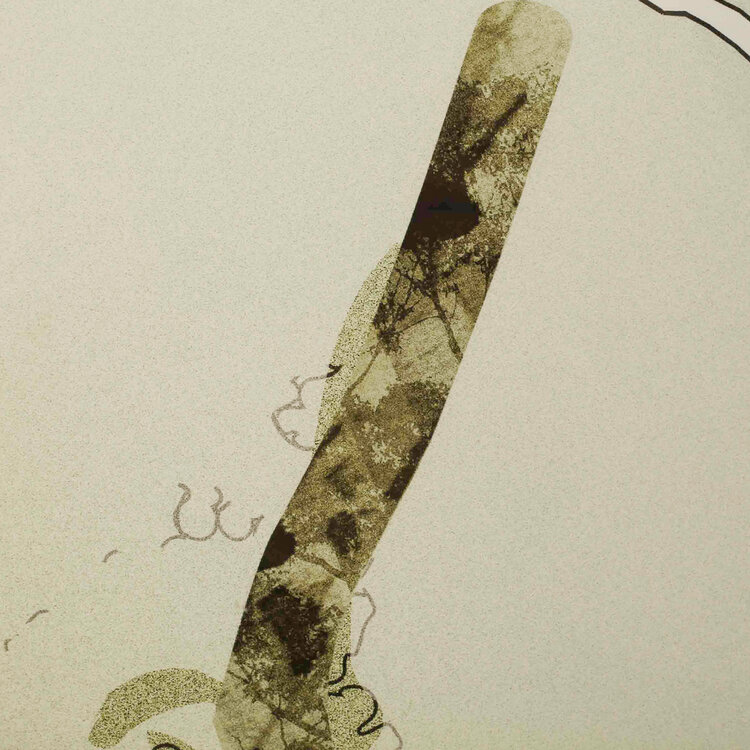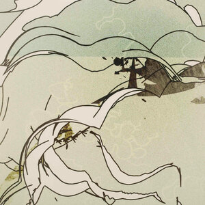 Eric Jarlsson, zonder titel, jaartal onbekend. Foto in zilver kleurige lijst. Abstracte compositie van zwarte lijnen voor een licht blauw-groene achtergrond. Conditie: gebruikssporen aan de lijst. Afmeting foto: 50 x 50 cm.