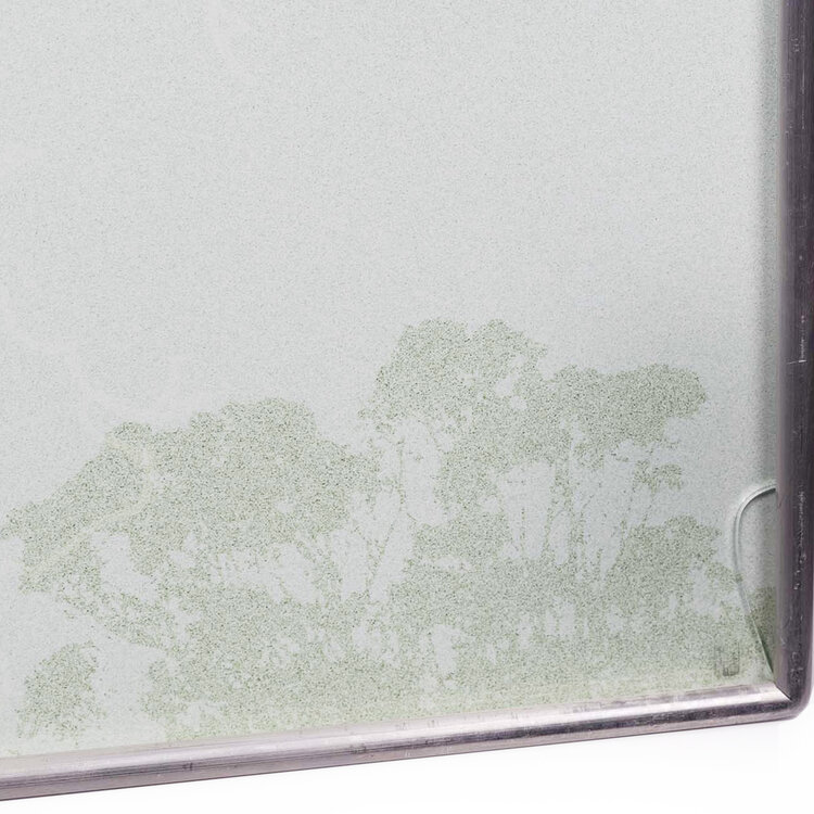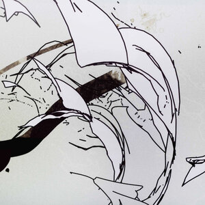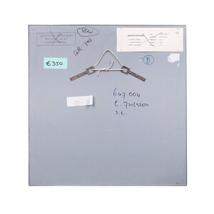 Eric Jarlsson, zonder titel, jaartal onbekend. Foto in zilver kleurige lijst. Abstracte compositie van zwarte lijnen voor een licht blauwgroene achtergrond. Conditie: gebruikssporen aan de lijst en barstje in het glas. Afmeting foto: ca. 51 x 51 cm.