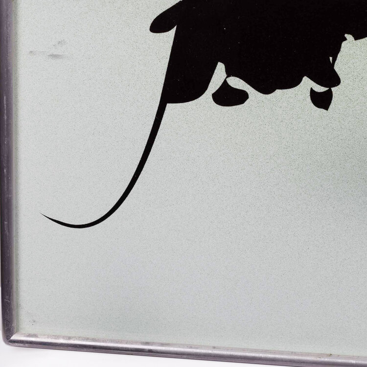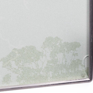 Eric Jarlsson, zonder titel, jaartal onbekend. Foto in zilver kleurige lijst. Abstracte compositie van zwarte lijnen voor een licht blauwgroene achtergrond. Conditie: gebruikssporen aan de lijst en barstje in het glas. Afmeting foto: ca. 51 x 51 cm.