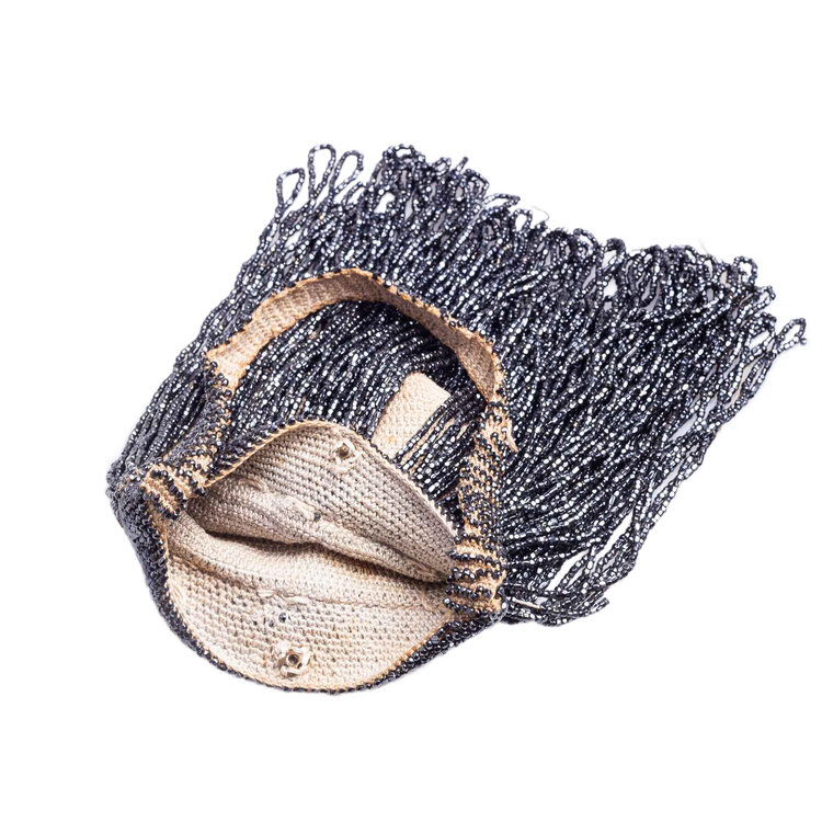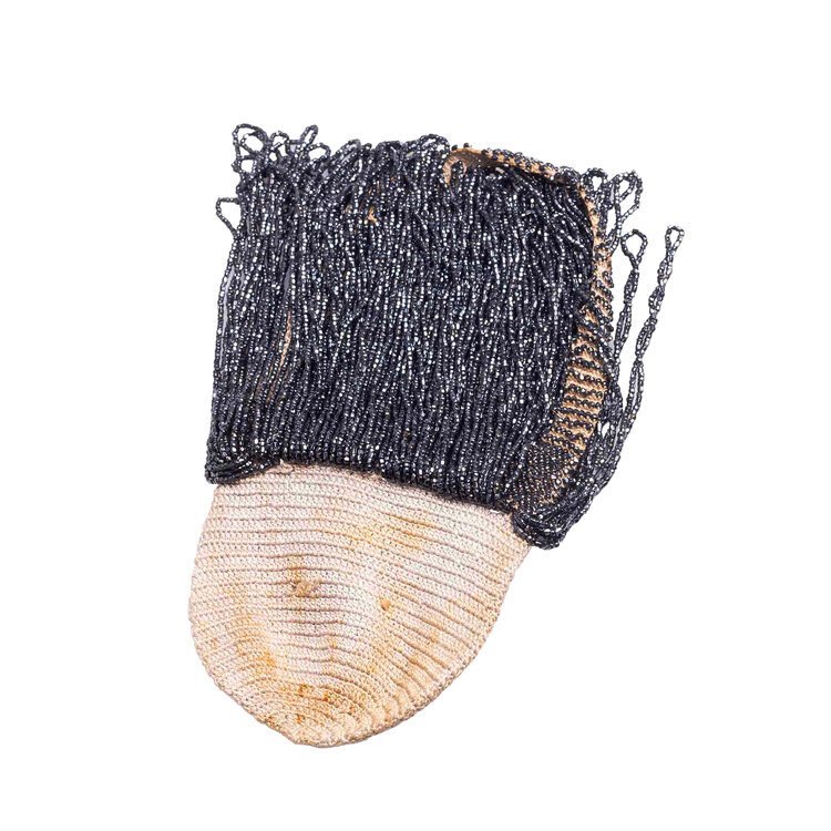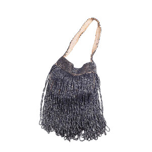 Gehaakt avondtasje met franjes van zwart geslepen kralen. De tas heeft een druksluiting en in het hengsel zijn rijen kralen mee-gehaakt. Datering: 1e helft 20ste eeuw. Conditie: hier en daar sporen van gebruik enouderdom, zoals vlekjes en losse kralen; maar nog in goede staat. Afmetingen ca.: 10 x 11 cm, hoogte incl hengsel is 30 cm.
