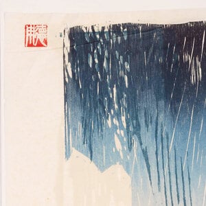 F. de Jong, Man in vallend water, 1984. Houtsnede op papier zonder lijst, oplage 1/20. Voorstelling in blauw, rood en beige met rood merkteken in de linkerbovenhoek. De voorstelling doet denken aan een man tegen een berglandschap. Conditie. Het werk is in prima conditie, wel zijn er vouwen aan de bovenzijde. Afmetingen: ca. 70 x 50 cm.