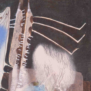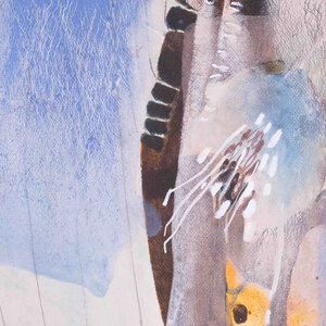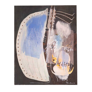 Fanny Mazure, Insect, 1984. Gemengde techniek op papier. Een abstract werk van een insect in bruin, blauw en geel. Volgens de kunstenares moet je "met je ogen in een schilderij op reis kunnen gaan en steeds nieuwe details ontdekken". Signatuur rechtsonder. Conditie: goed, aan de achterkant resten van tape. Afmeting papier: 64 x 50 cm.