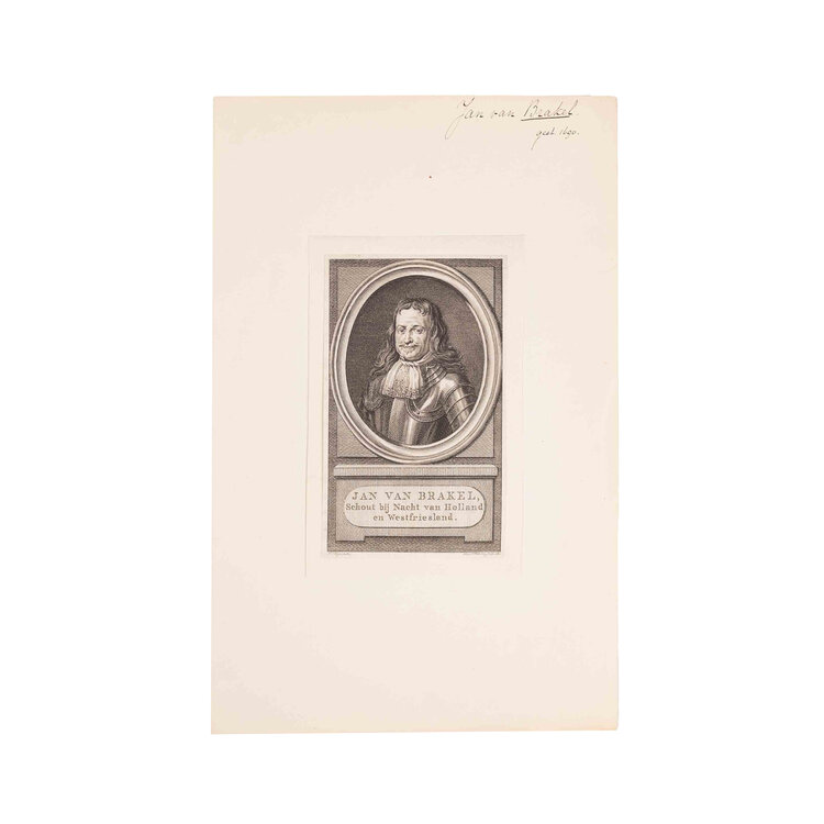 Prent 'Jan van Brakel' (Rotterdam, ca. 1618 - 10 juli 1690), Schout bij Nacht van Holland en Westfriesland; Prent 'Willem van der Zaan' (Amsterdam, 29 juni 1621 - voor de kust van Marokko, 17 maart 1669), Schout bij Nacht; Prent 'Jan Hendrik van Kinsbergen' (Doesburg, 1 mei 1735 - Apeldoorn, 24 mei 1819), De ridder van Kinsbergen, Kapitein ter Zee; Prent 'Jacob Pieter van Braam' (Werkhoven, 27 oktober 1737 - Zwolle, 16 juli 1803), Kapitein ter Zee; Prent 'Johan Evertsen' (Vlissingen, 1 februari 1600 - Noordzee/ Walcheren, 5 augustus 1666), Luitenant-Admiraal van Zeeland. Gravures van Reinier Vinkeles. De prenten zijn zwart-wit. Datering: ca. 1760-1785. Conditie: De prenten vertonen sporen van ouderdom. Verkleuring, vlekken en kleine beschadigingen aan de randen. De prenten zijn geplakt op een vel. Afmetingen beeldvlak prenten: ca. 15 x 9 cm.