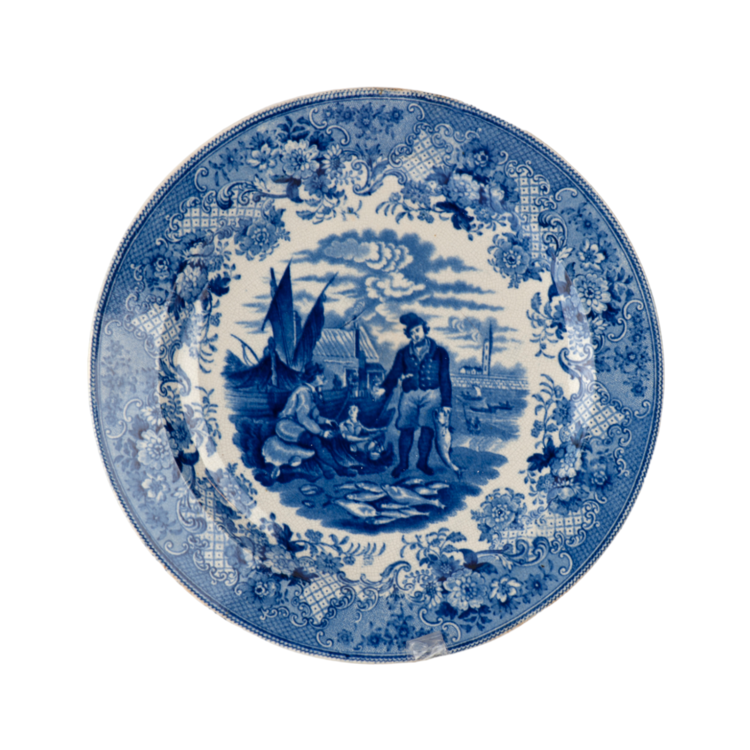 Set van vijf aardewerken wandborden met voorstelling 'De Visscherman'. Het decor is geproduceerd door de Maastrichtse aardewerkfabriek Petrus Regout. Datering: ca.1865. Conditie: goed met gebruikssporen, een wandbord is gerepareerd. Afmetingen: diameter 21.2 cm.