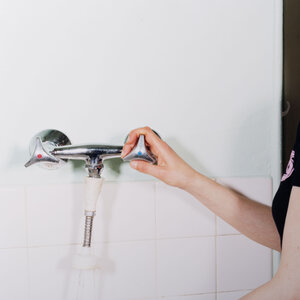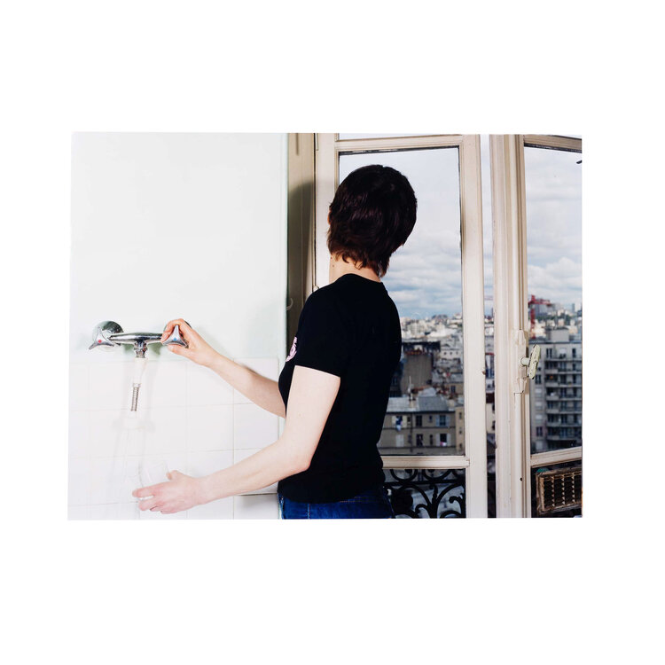 Foto, 'Chaud et froid', uit een serie van vier foto's van Florence Paradeis (1964, Antony, Frankrijk) in Angers, Frankrijk, 2001. Foto op kunststof plaat van een vrouw draaiend aan een kraan. Ze kijkt uit een raam met uitzicht op Angers. Signatuur op de achterkant. Over deze serie zei Florence Paradeis: "Interior: The home of vision, the closed place where an occult relation connects us with an invisible partner." Deze fotoserie behoort tot de foto expositie 'Les intérieurs du monde' uit 2001 in het Zaans Museum. Een fascinerend document van interieurs in 7 steden door 14 fotografen uit 5 landen, in samenwerking tussen de gemeenten Zaanstad en Haarlem met hun zustersteden. Angers heeft een stedenband met Haarlem. Conditie: Vertonen gebruikssporen, taperesten op de achterkant. Afmetingen: 30 x 40 cm.