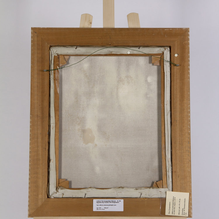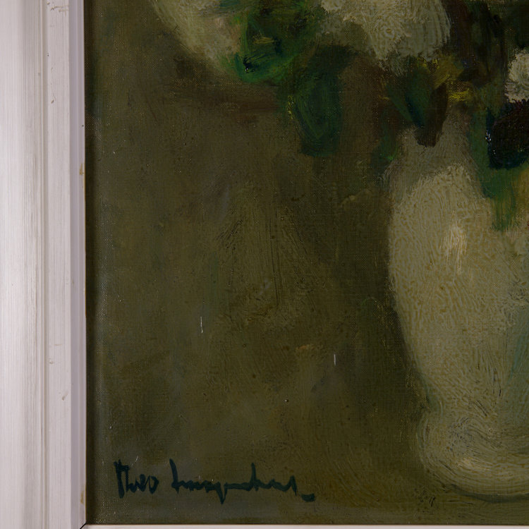Theo Swagemakers, Bloemstilleven met witte vaas, ca. 1930-90. Olieverf op doek, werk 50.5 x 40 cm, lijst 62.7 x 53.7 cm. Fraai bloemstilleven van een gemengd boeket in een witte vaas tegen een onverzadigde groene achtergrond. Gesigneerd linksonder. Onder dit doek is een ander doek op het spanraam gespannen. Het werk is ingelijst in een houten lijst. Theo Swagemakers (1898-1994) is een bekende Nederlandse schilder van voornamelijk portretten en stillevens. Hij genoot zijn opleiding in Brussel en Parijs en heeft verschillende beroemdheden mogen portretteren, zoals een groot deel van de Koninklijke familie. Hiervoor heeft hij de Thérèse van Duyl-Schwartzeprijs in ontvangst mogen nemen in 1958. Conditie: het werk is in prima conditie. Het vernis is vergeeld. De lijst is in goede conditie met enkele gebruikssporen.