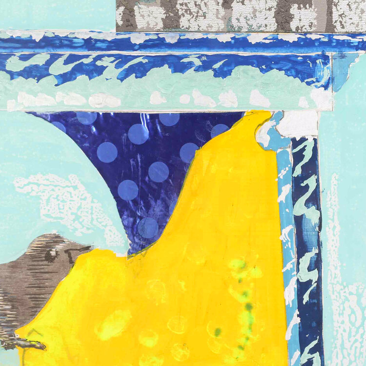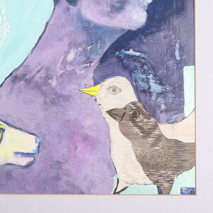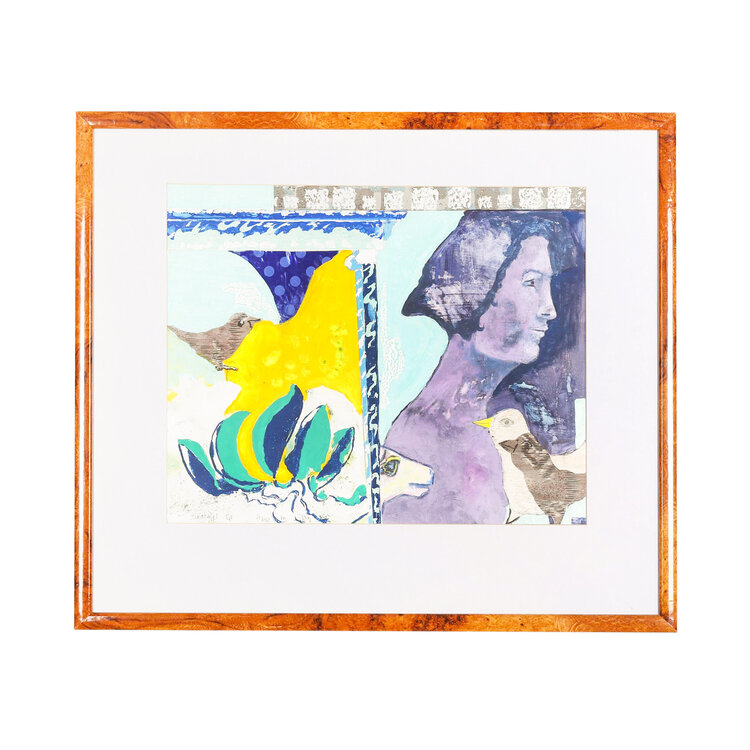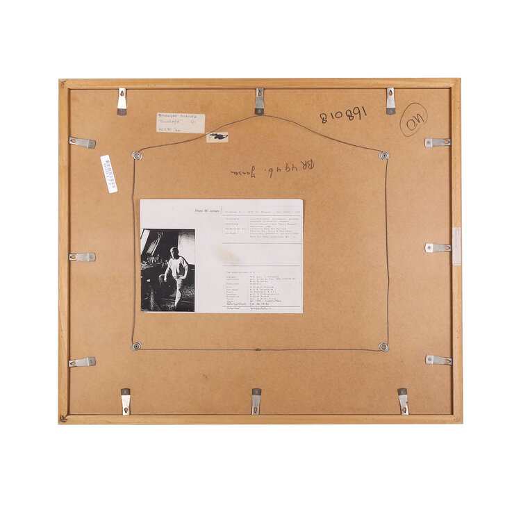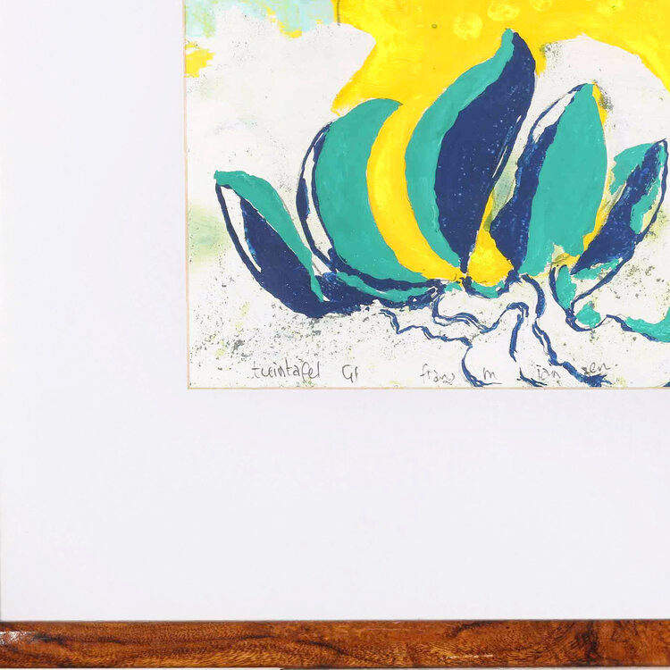 F.M. Jansen, Tuintafel G1, jaartal onbekend. Gemengde techniek op papier in bruine kunststof lijst. Kleurrijke compositie van rechts een figuur in paars en twee vogels in lila passe-partout. Onderaan signatuur en titel. Op de achterzijde een A4 vel geplakt met informatie over de kunstenaar. Conditie: goed, gebruikssporen aan lijst. Afmeting lijst: 60 x 70 cm.